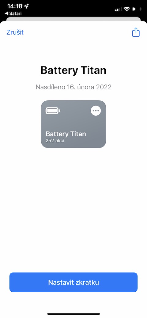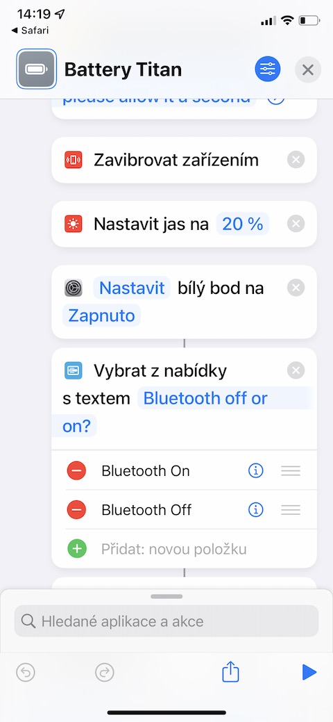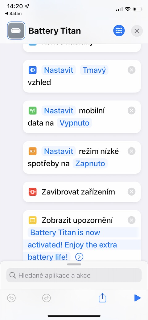 Stejně jako v předchozích dílech našeho seriálu o iOS zkratkách vám i dnes přinášíme tip na zkratku, která vám umožní ušetřit pár procent baterie vašeho iPhonu. Battery Titan vám po své aktivaci mírně sníží jas displeje, nastaví tmavý vzhled, vypne mobilní data a provede pár dalších akcí, díky kterým alespoň o něco zpomalíte vybíjení baterie vašeho iPhonu.