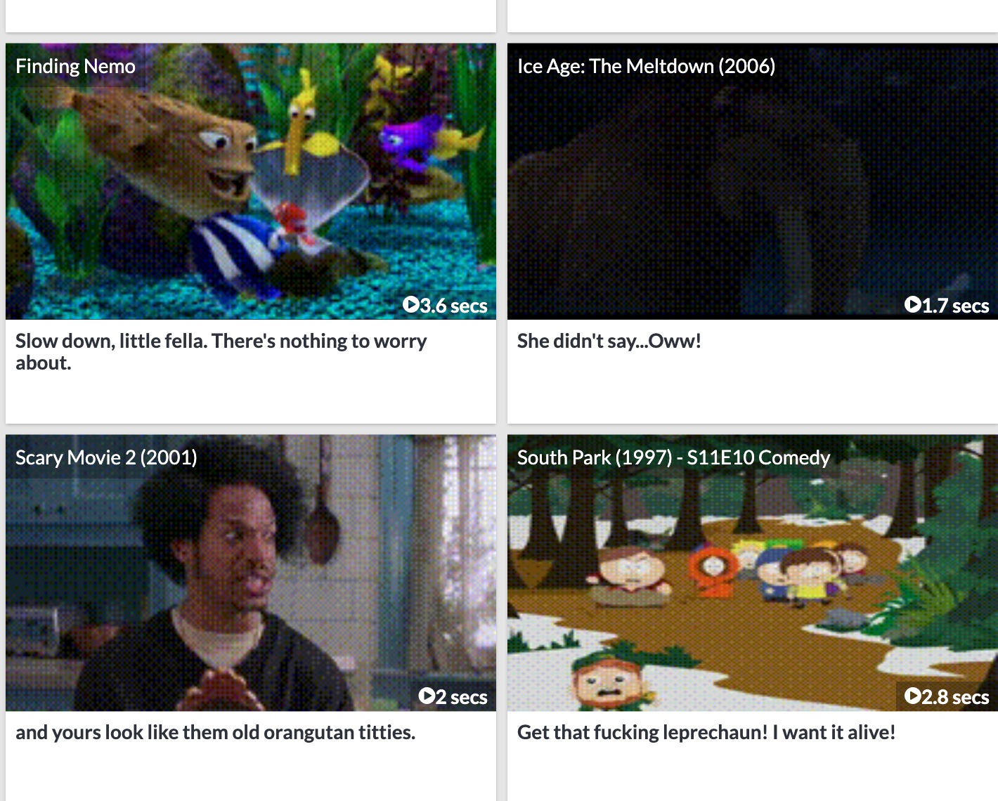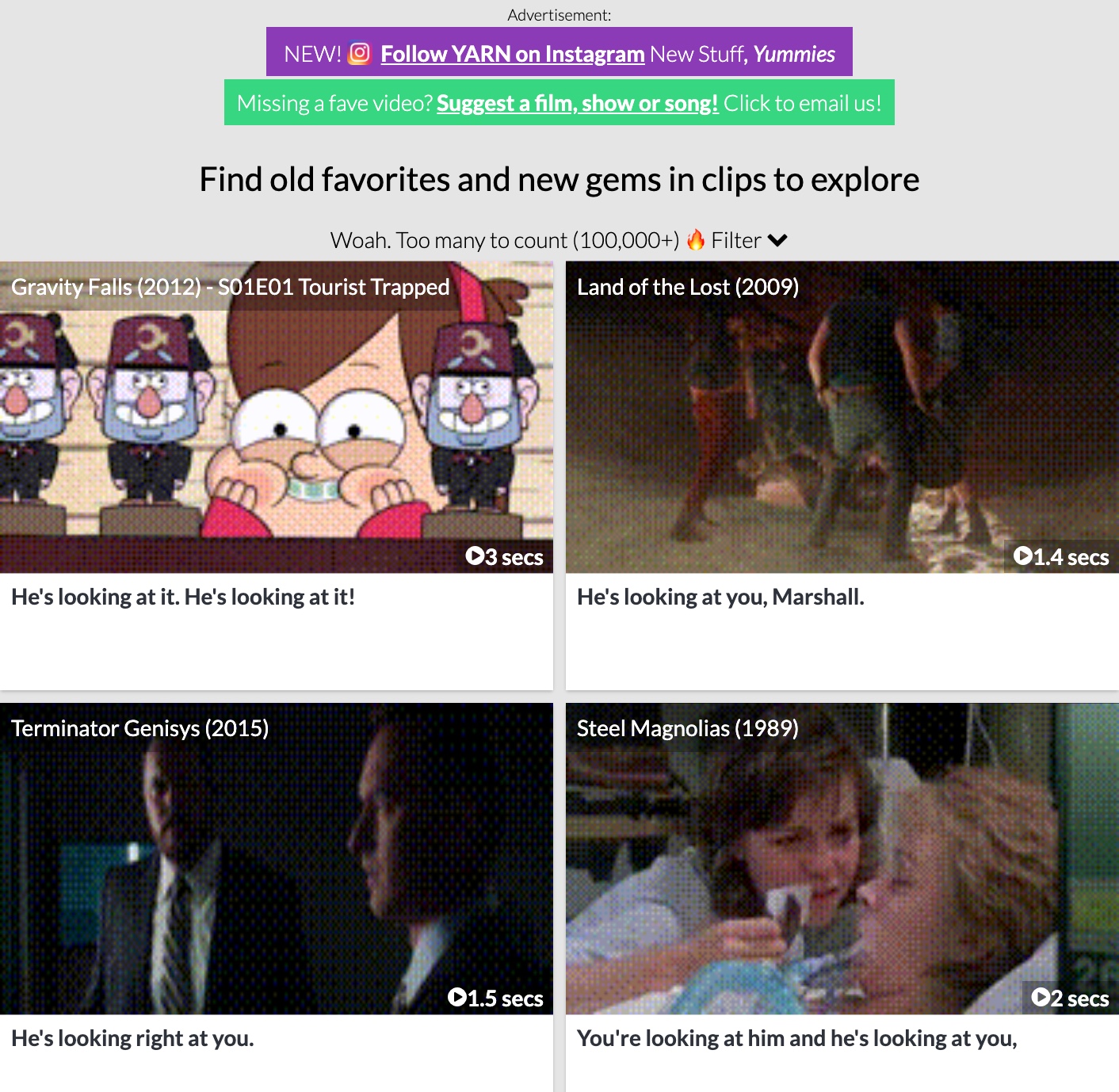 Kdo by neměl rád nejrůznější hlášky a citáty z filmů a seriálů? Ať už si chcete zavzpomínat na konkrétní část vašeho oblíbeného filmu nebo seriálu, nebo třeba použít vybraný výrok coby reakci, určitě vám přijde vhod web Yarn.co. Do vyhledávacího pole v horní části této stránky stačí zadat požadovanou větu a zobrazí se vám přehled všech filmů nebo seriálů, ve kterých zazněla.