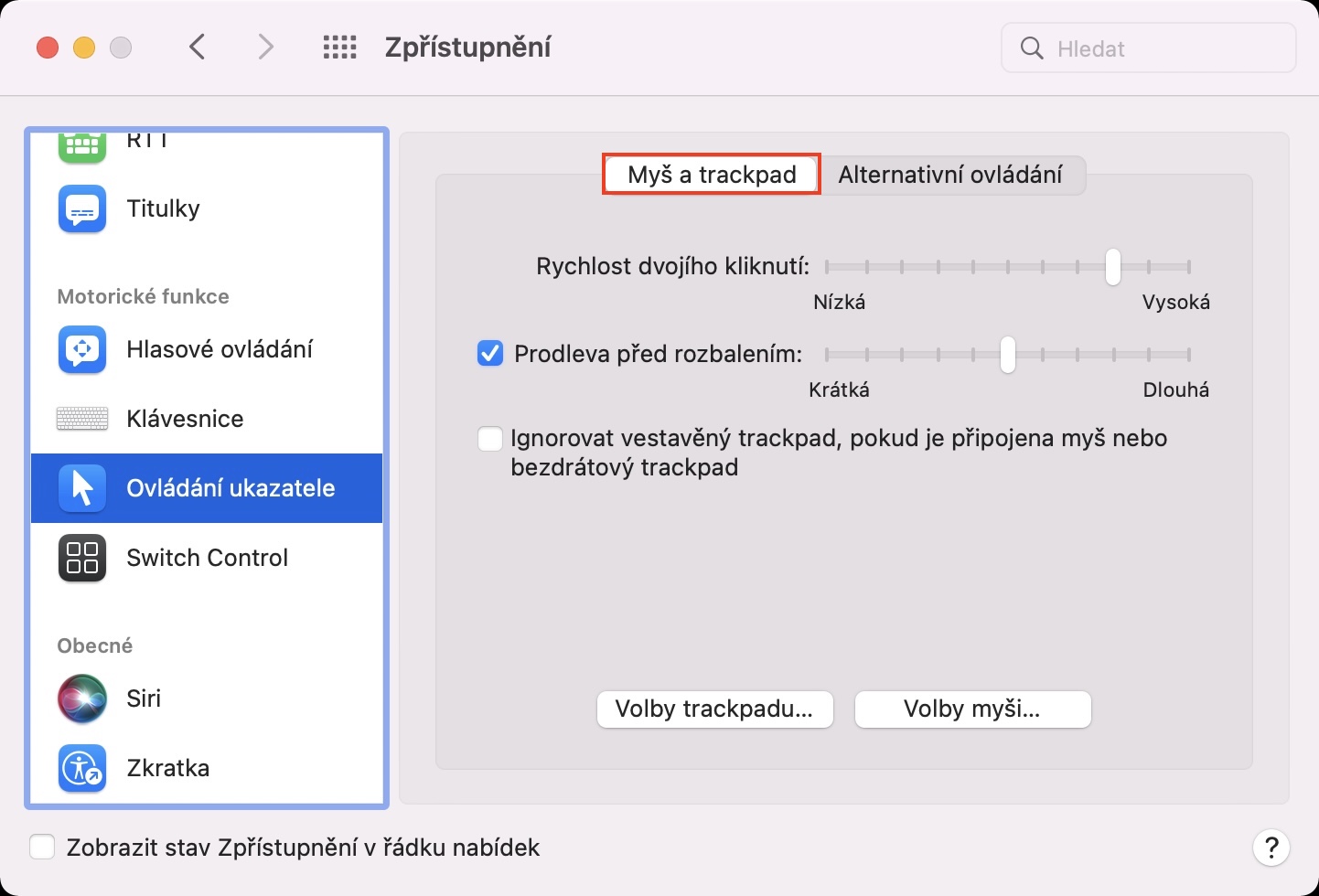 - Poté se v horní části okna přesvědčte, že se nacházíte v záložce Myš a trackpad.