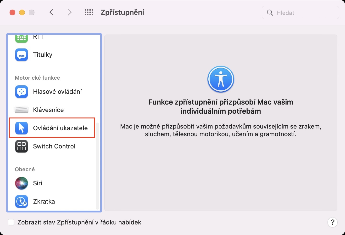 - Zde pak v levém menu lokalizujte kolonku Ovládání ukazatele.