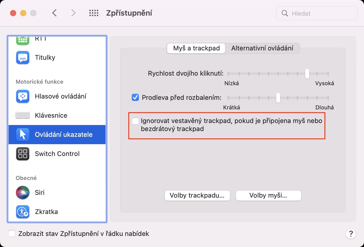 - Tady už jen stačí, abyste zaškrtnuli možnost Ignorovat vestavěný trackpad, pokud je připojena myš nebo bezdrátový trackpad.