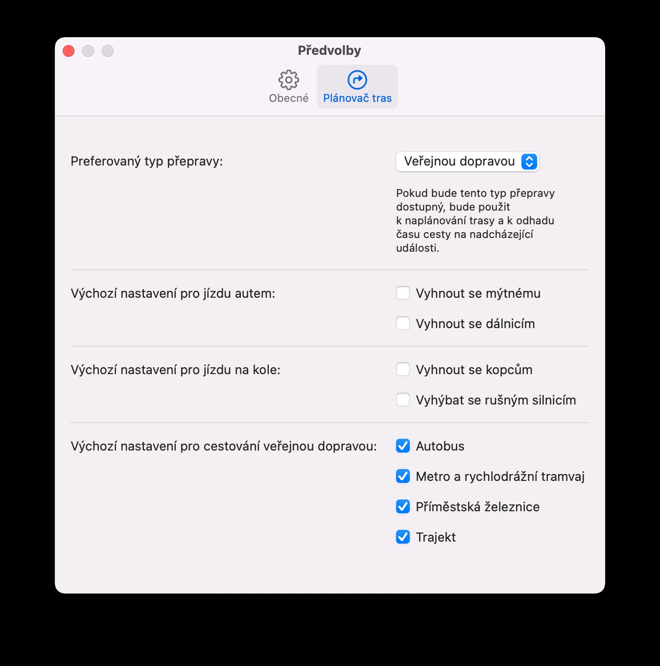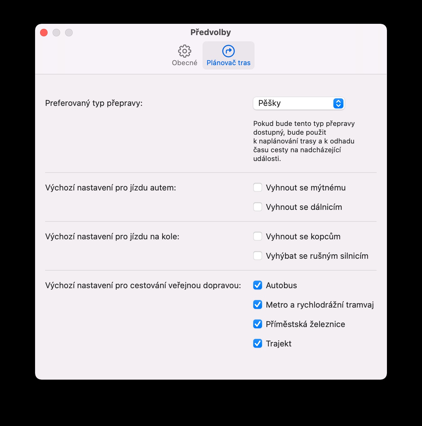 Přepravujete se nejčastěji pěšky, ale Mapy na vašem Macu vám neustále automaticky generují trasy pro jízdy autem? Abyste si nemuseli pokaždé ručně upravovat způsob přepravy z bodu A do bodu B, klikněte na liště nabídek v horní části obrazovky vašeho Macu na Mapy -> Předvolby. V horní části okna předvoleb klikněte na kartu Plánovač tras. Zde můžete nejen zvolit preferovaný způsob dopravy, ale také upravit výchozí nastavení pro jízdu na kole, cestování veřejnou dopravou i jízdu autem.