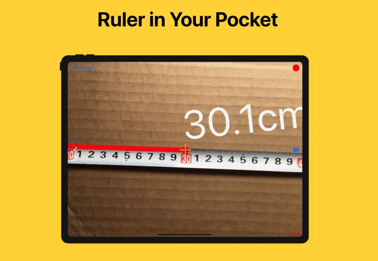 Pokud hledáte nějakou alternativu za nativní aplikaci Měření, tak by vás možná mohl zaujmout nástroj Ruler – tape measure length. Tento program taktéž používá rozšířenou realitu, dokáže si poradit s měřením několika úseků najednou, které rozlišuje odlišnými barvami.