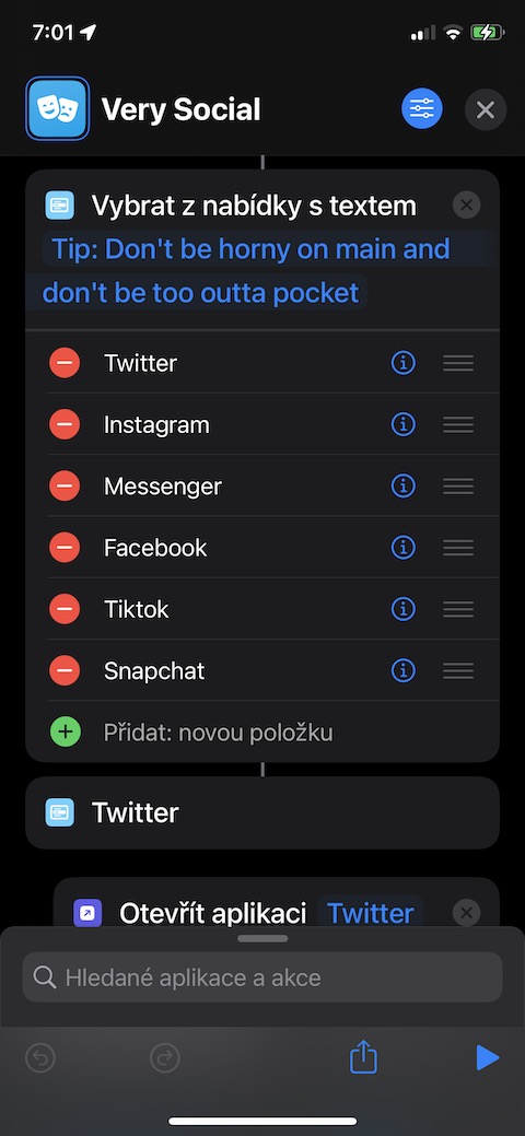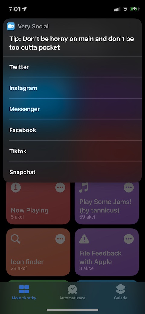 Zkratka s všeříkajícím názvem Easy Socials Menu slouží jako jednoduchý, funkční a užitečný rozcestník, který vás okamžitě nasměruje k jednotlivým aplikacím vašich sociálních sítí. V nastavení zkratky si můžete přidat další aplikace, ke kterým chcete získat rychlý a okamžitý přístup, případně odstranit ty, které nepoužíváte.