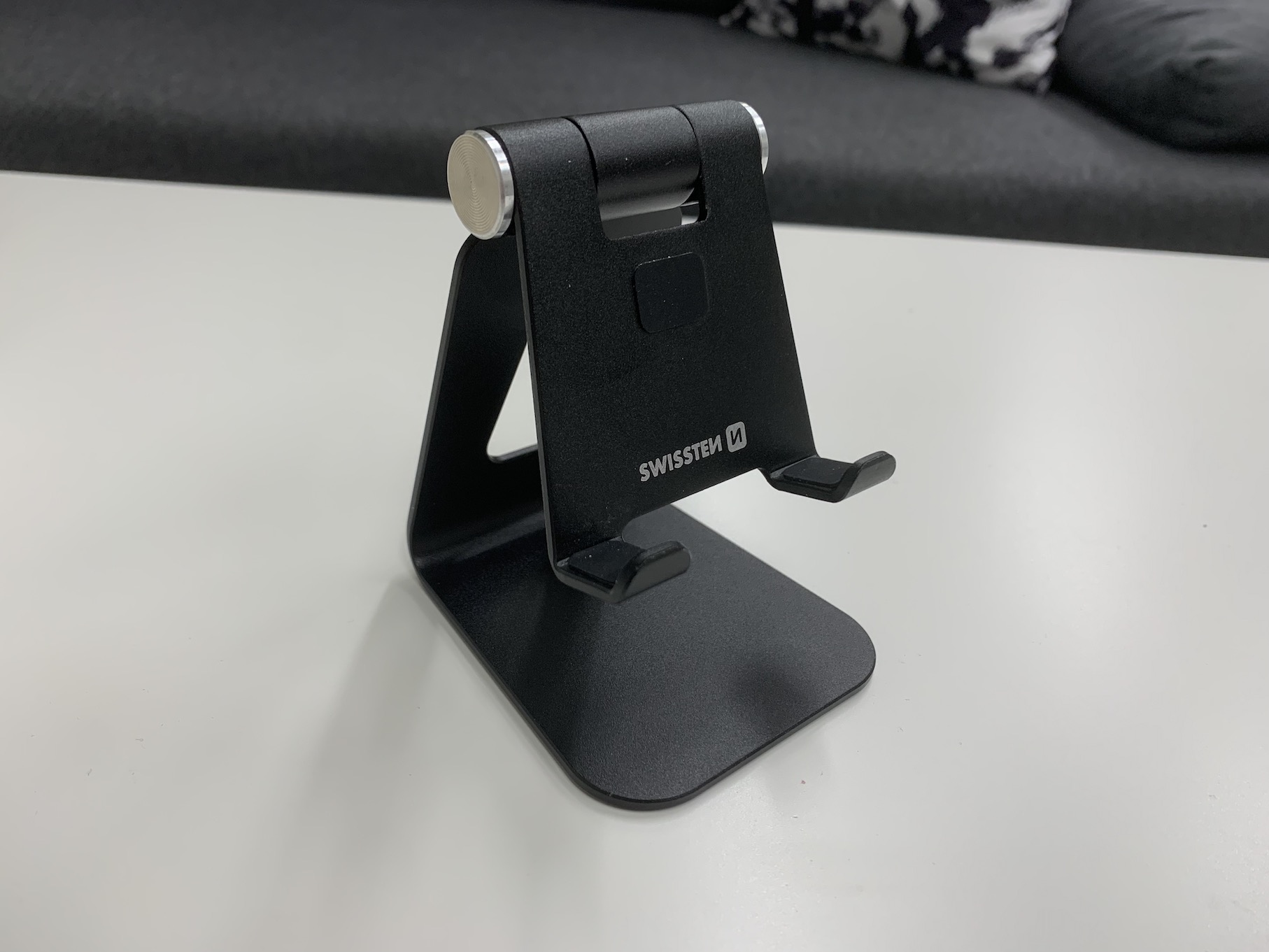 Ihned, jakmile jsem tento stojan vzal do ruky, tak mě mile překvapilo jeho zpracování. Stojan na iPhone od Swisstenu je totiž vyroben z hliníku, který je v tomto případě opravdu robustní. Stojan má černou barvu, tedy kromě bílého brandingu na přední straně a kloubů, které se nachází na boku. Díky těmto kloubům můžete měnit náklon stojanu, což rozhodně oceníte. Klouby jsou velmi tuhé a kvalitní, takže se nestane, že by povolily. Pochválit musím využití protiskluzových částí, které se nachází na spodních dvou ramenech a na přední straně, kde se opírá telefon zády o stojan – máte tak jistotu, že nedojde k poškrábání.