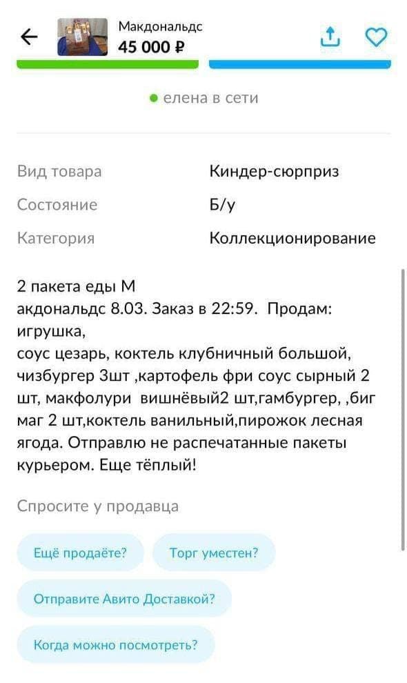 V dnešní moderní době je skoro až neuvěřitelné vidět, co všechno jsou lidé v nestandardní situaci přes internet prodávat a ve výsledku i to, co jsou přes něj ochotni kupovat. Je totiž prakticky jisté, že pár úspěšných prodejů již někým zakoupených fastfoodových pokrmů proběhlo, jelikož se před řetězci stály před zavřením extrémní fronty dokazující, že o jejich jídlo zájem mezi Rusy rozhodně je. Poměrně zajímavé je nicméně to, že například iPhony a tak podobně se na podobných tržnicích v Rusku zatím ve velkém objevovat nepřestaly. Je nicméně otázkou, co se stane, až se začnou celosvětově prodávat novinky, které Apple ukázal v úterý a které se jinak do Ruska než skrze tuto „šedou zónu“ nedostanou.
