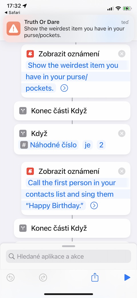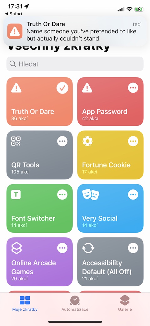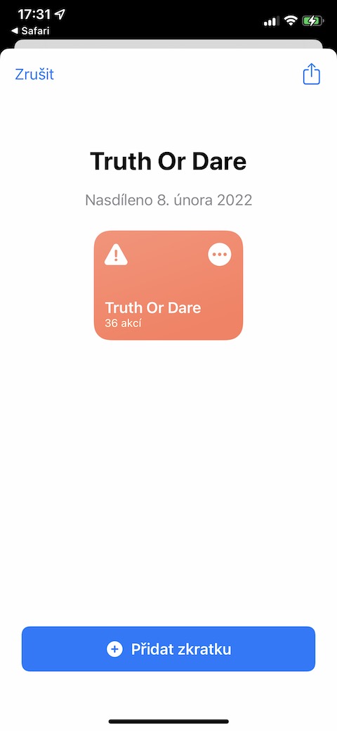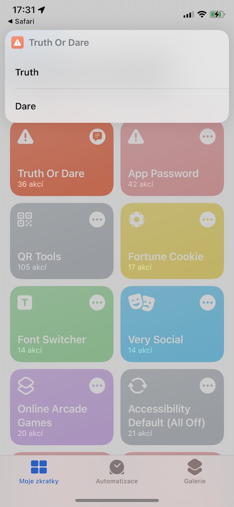 Znáte hru „Pravda nebo úkol“? A chtěli byste si ji zahrát s vašimi přáteli? Zkratka s názvem Truth or dare vám to umožní. Po spuštění této zkratky se na displeji vašeho iPhonu objeví menu, ze kterého vyberete buďto otázku, nebo úkol. Zkratka je v angličtině.