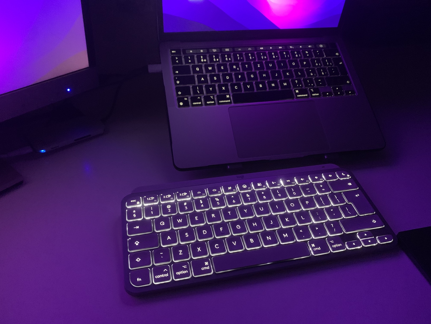 Připojení klávesnice k jednotlivým zařízením probíhá čistě pomocí Bluetooth. Nemusíte tedy využívat žádný USB přijímač a dle mého názoru je tohle řešení (nejen) pro uživatele jablečných počítačů nejlepší. Ty totiž všechny Bluetooth disponují, takže se nemusíte strachovat ohledně kompatibility. Je jasné, že pokud vlastníte nějaký starší počítač, kde nemáte Bluetooth k dispozici, tak MX Keys Mini nebudete schopni využívat. Asi největším trhákem této klávesnice je každopádně již zmíněné podsvícení, které je naprosto parádní a rychle si na něj zvyknete. Podsvícení má bílou barvu a klávesnice po jeho aktivaci vypadá opravdu elegantně. Podsvícení se aktivuje automaticky v případě, že na klávesnici položíte ruce. Pokud je zvednete, tak se podsvícení opět za pár sekund vypne, čímž dochází k šetření baterie. V noci je podsvícení velmi jasné a není nutné ho mít nastavené naplno. Ve dne pak podsvícení doporučuji úplně vypnout, jelikož vzhledem k barvě klávesnice a podsvícení dochází ke splynutí znaků, což není příjemné. Zároveň díky tomu ušetříte baterii. Při dobrých světelných podmínkách jsou tak klávesy dobře čitelné bez podsvícení.