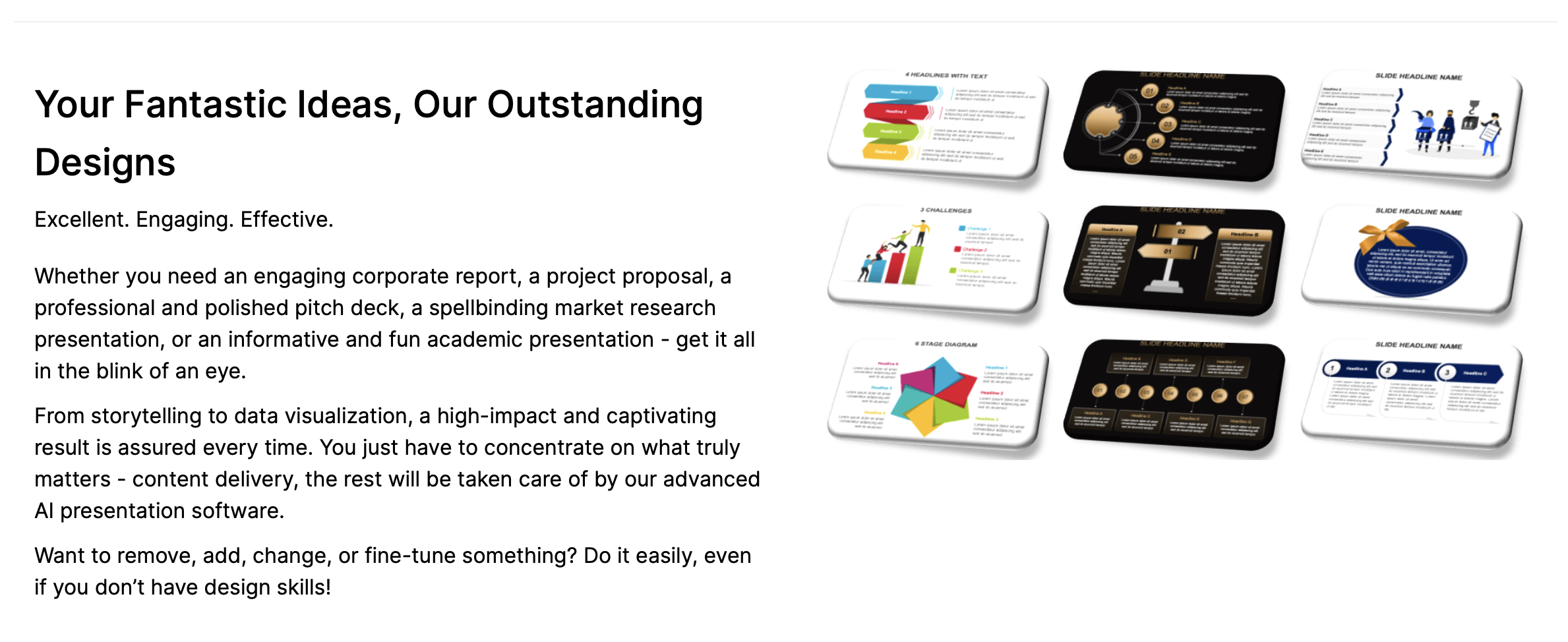 SketchBubble AIje nástroj založený na umělé inteligenci, který zjednodušuje proces vytváření působivých prezentací. Pomáhá uživatelům vytvářet strukturované, profesionálně vypadající snímky s jasným tokem a konzistencí. Automatizací opakujících se úkolů šetří čas a umožňuje prezentujícím se více soustředit na své sdělení a přednes. Finální prezentace lze snadno exportovat do PowerPointu a Google Slides pro plynulé použití.