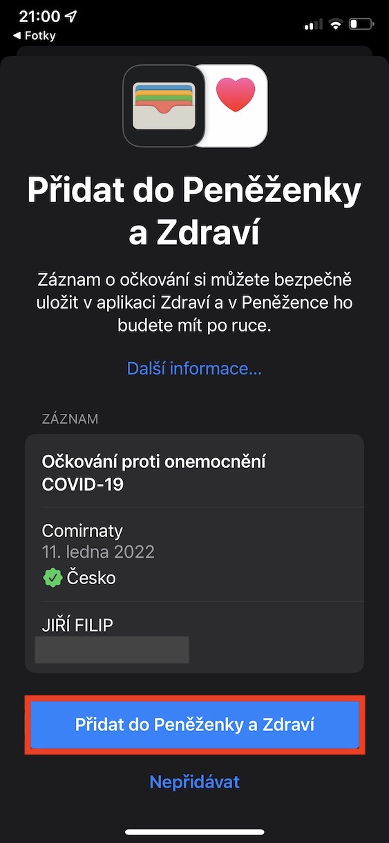 Zmíněná aplikace Tečka samozřejmě funguje jednoduše a prakticky bezproblémově, když ale Apple představí své vlastní řešení, tak je ve většině případech elegantnější a hlavně jednodušší na použití. Navíc k tomu, co si budeme nalhávat, rozhodně je více stylovější svůj očkovací certifikát na iPhonu ukázat tak, že dvakrát stisknete tlačítko a v rámci rozhraní Apple Wallet jej najdete a předložíte. U Tečky je nutné odemknout iPhone, otevřít aplikaci a certifikát rozkliknout – zkrátka a jednoduše, zbytečně zdlouhavý postup. Pro přidání očkovacího certifikátu do Zdraví a Apple Wallet stačí pokračovat následovně:
