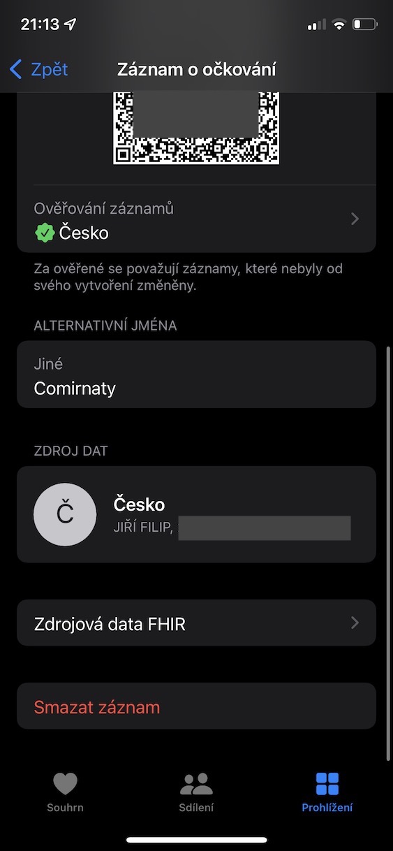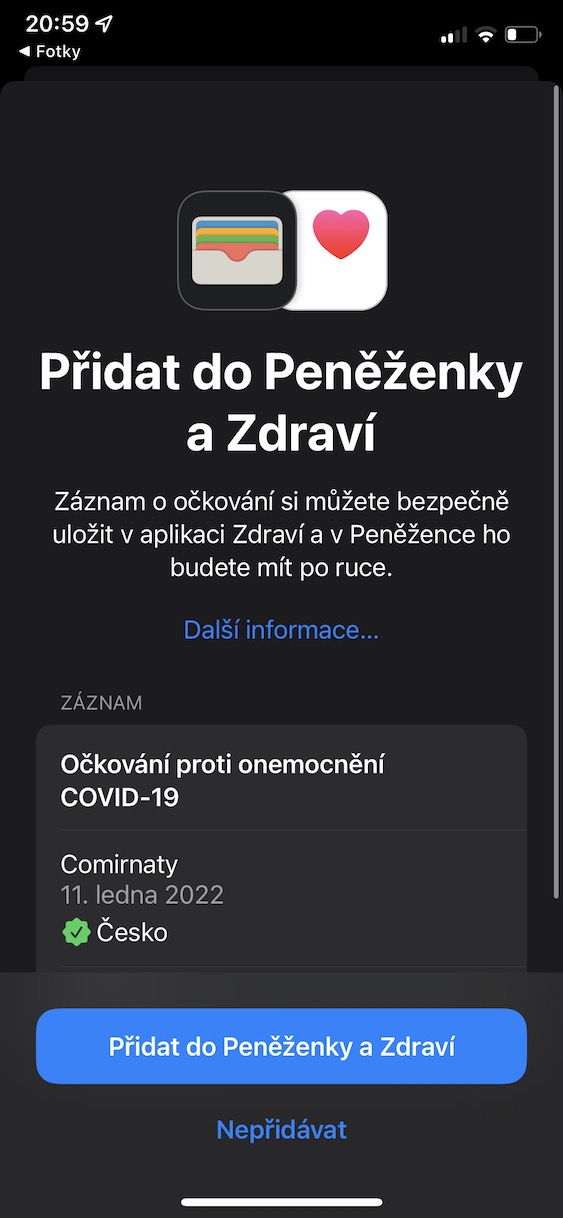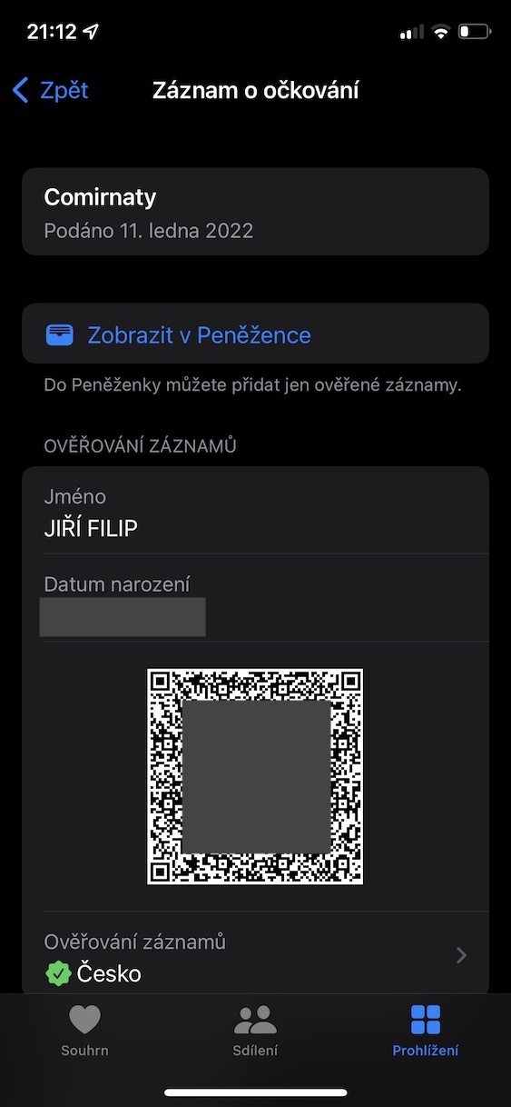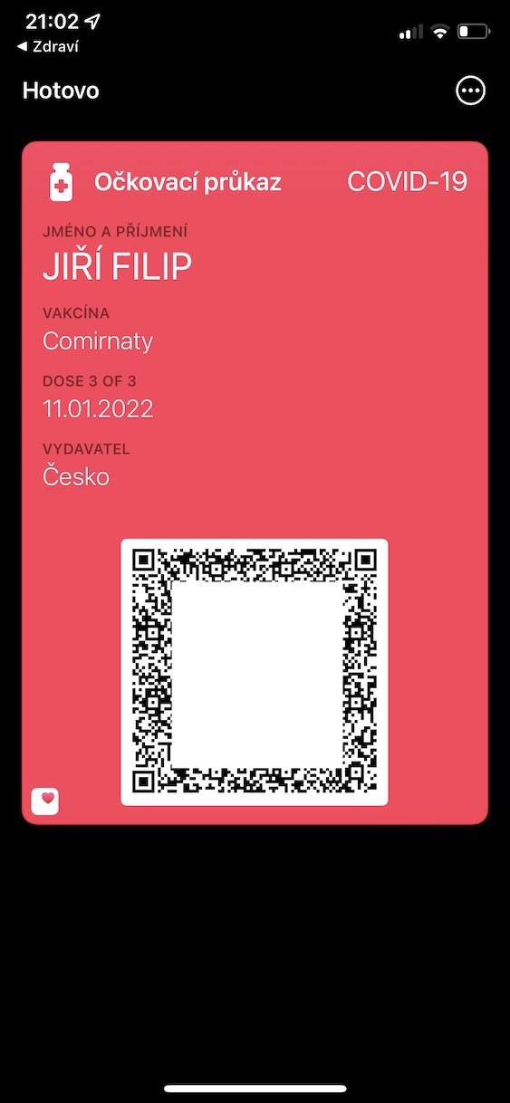 Pomocí výše uvedeného postupu je tedy možné do Zdraví a Apple Wallet přidat váš očkovací certifikát. V některých případech se můžete ocitnout v situaci, kdy se vám ke konci zobrazí hláška o tom, že nebylo možné certifikát přidat do Apple Wallet. Tato hláška je chybná a stačí ji jednoduše potvrdit – i přesto svůj certifikát v rámci Apple Wallet najdete, takže se není čeho obávat. Pokud vám postup výše nefunguje a po podržení prstu na QR kódu se nezobrazí možnost pro přidání, tak si zkontrolujte, zdali máte aktivní funkci Živý text, která je nebytná. Ve Zdraví pak svůj očkovací certifikát najdete v sekci Imunizace. Pro zobrazení certifikátu v Apple Wallet tedy stačí, abyste do ní přešli, stejně jako při využití Apple Pay, a poté na něj prstem klepnuli, čímž se ihned zobrazí. Certifikát je k dispozici v Apple Wallet i na Apple Watch. Elegantní, jednoduché a hlavně rychlé.