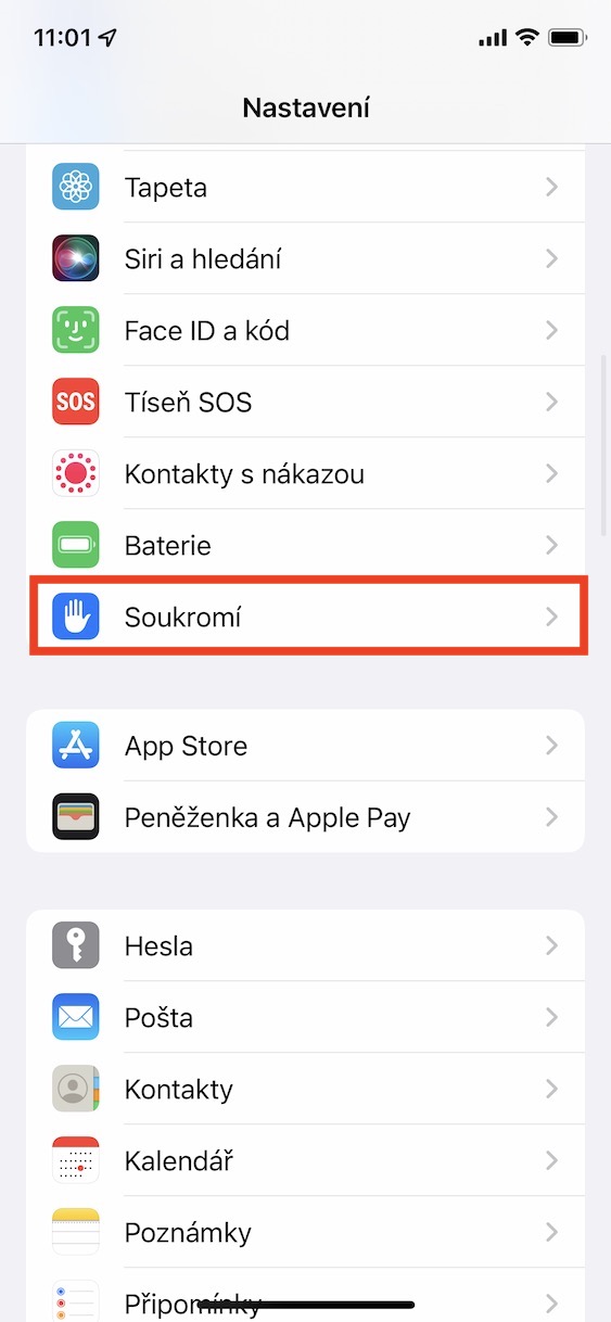 - Následně sjeďte o kus níže, kde najděte a otevřete sekci Soukromí.
