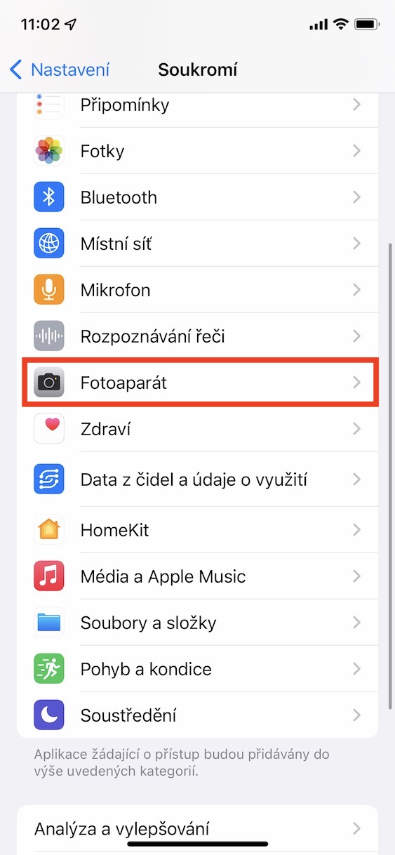 - Zde pak najděte kolonku Fotoaparát a rozklikněte ji.