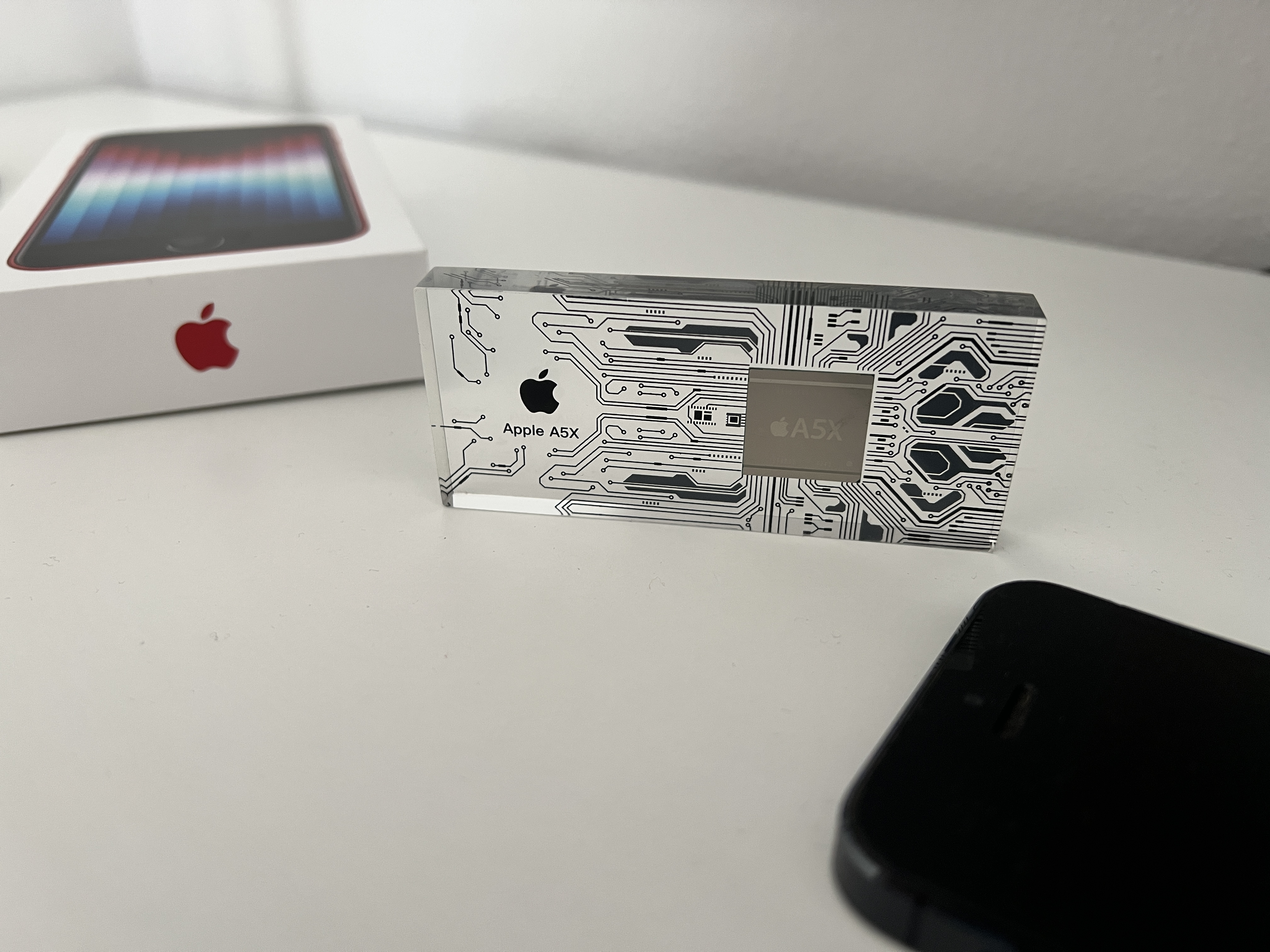 Před pár týdny jsme si pak s kolegou Romanem udělali radost a sáhli po dalším kousku z dílny Grid. Tentokrát se však nejedná o obraz, nýbrž o procesor Apple A5X, který byl nasazen jen a pouze ve třetí generaci iPadu. Grid totiž rozšířil svou obrazovou nabídku právě o procesory zalité zřejmě do průhledného plastu, který umožňuje si je prohlédnout detailně (a přitom bez jakéhokoliv prachu a jiných nečistot) z obou stran. Musím říci, že i tento kousek vypadá vskutku překrásně a přestože ani jeho cena nebyla nejnižší, jakožto správnému fanouškovi Applu mi dělá na mém pracovním stole radost.