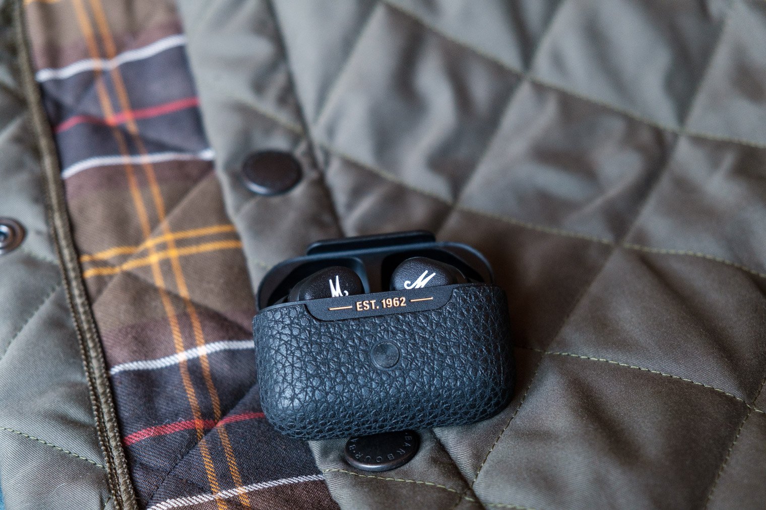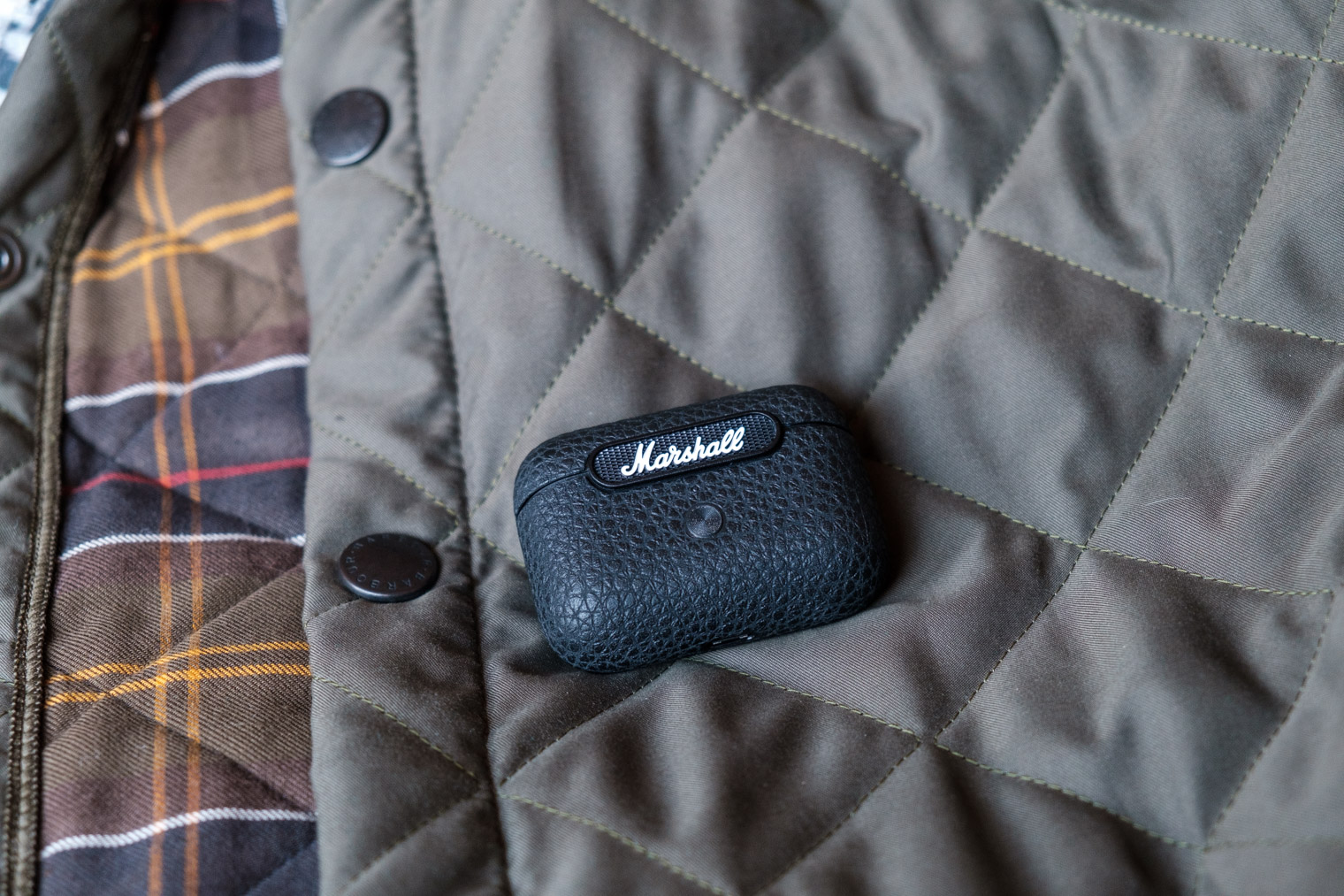 Nabíjecí pouzdro sluchátek je potaženo plastovou dekorační vrstvou, která imituje kůži. Jde o překvapivě povedené provedení a pouzdro díky tomu vypadá dobře, dobře se drží a zároveň je i odolné vůči drobnému fyzickému poškození. Na přední straně pouzdra najdeme logo Marshall, které je součástí zavíracího víka a pod kterým se schovává designový doplněk ve formě data založení společnosti Marshall. Uprostřed přední části najdeme tlačítko pro párování a reset sluchátek. Na spodní straně se nachází nabíjecí USB-C konektor, na zadní pak najdeme kus „obyčejného“ plastu, pod kterým se skrývají kontakty pro bezdrátové nabíjení. Zavírací mechanismus pouzdra je plastový, ale zároveň je poměrně bytelně provedený.