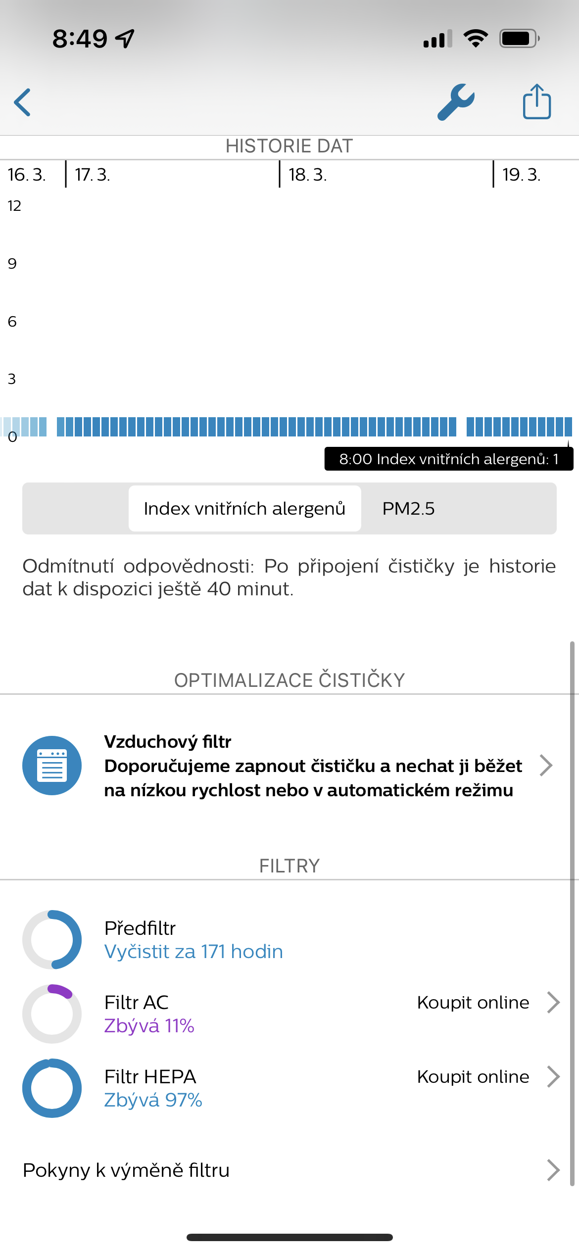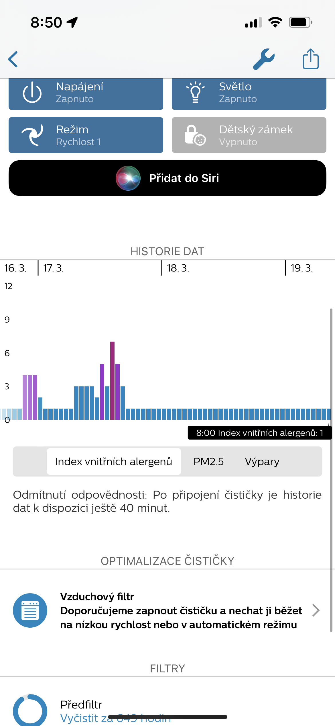 Na prvním místě toho, co mě baví ovládat vzdáleně je rozhodně vysavač. My doma používáme Miele Scout a o tom, jak jej můžete ovládat vzdáleně jsme si již napsali v samostatné recenzi tohoto pomocníka. Mám rád, když jedemě někam na víkend nebo na dovolenou a mohu v den návratu domů zapnout na stovky kilometrů vysavač, který vysaje celý byt a nakonec se opět vrátí tam, kde začal. Baví mě zkrátka přijet do čistého a to i po několika týdnech, kdy i když máte před odjezdem uklizeno, nějaký ten prach se na zemi už objeví. Takto stačí stisknout tlačítko a vracíte se do perfektně uklizené podlahy. Spolu s tím souvisí i čistička vzduchu, kterou sice máme zaplou nonstop na automatickém režimu, ale když už pustím vysavač, zvýším rovnou i výkon čističky, aby byl vzduch po návratu domů co nejčistčí a navíc, pokud máte kvalitnější čističku s HEPA filtrem, pak určitě moc dobře znáte, takovou tu příjemnou jemnou vůni, kterou má vyčištěný vzduch, zkrátka jak kdybyste se z hor vrátili domů zase zpět do hor nebo k moři. Čističku od Philipsu mám i v kanceláři, takže mohu jak byt, tak kancl ovládat pomocí jedné aplikace, co se čištění vzduchu týká. Navíc mi aplikace sama řekne, kdy je potřeba vyměnit filtr nebo vyčistit předfiltr.