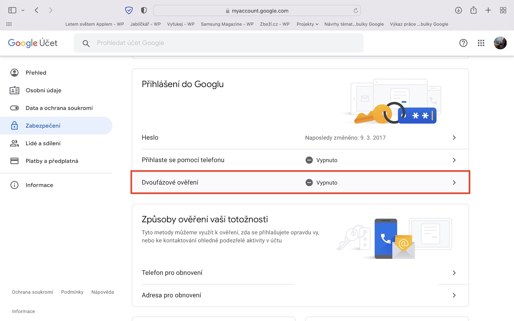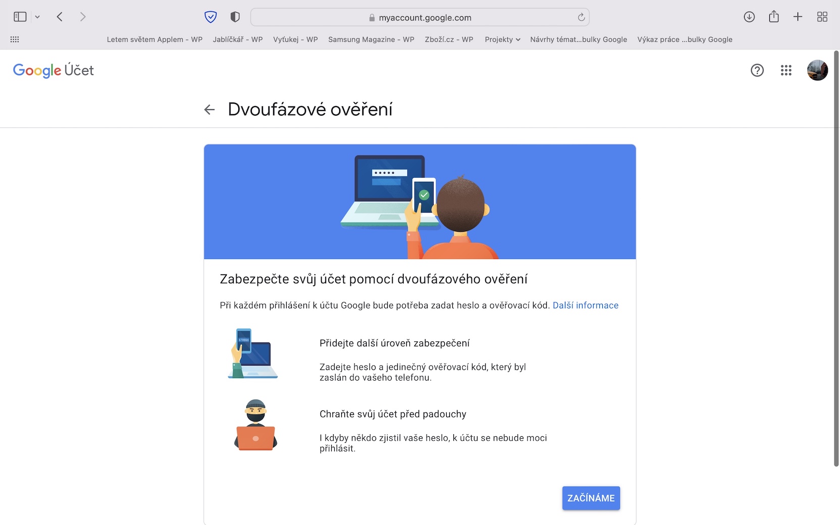 Chcete-li být v dnešní době stoprocentně chráněni před zneužitím vašeho účtu, tak je nutné, abyste měli aktivní dvoufázové ověření. Tento typ ověření se skládá ze dvou kroků. Prvním krokem je přihlašovací jméno a heslo, druhým krokem pak nějaký další typ ověření, například pomocí telefonu či speciální aplikace. Díky dvoufázovému ověření si můžete být jistí tím, že i kdyby útočník získal přístup k vašim přihlašovacím údajům, tak se do účtu nedostane, jelikož je nutné přihlášení potvrdit také druhým způsobem. Dvoufázové ověření pro Google účty aktivujete na stránce Zabezpečení, kde sjeďte níže, dále v kategorii Přihlášení do Googlu klepněte na Dvoufázové ověření a nakonec projděte průvodcem.