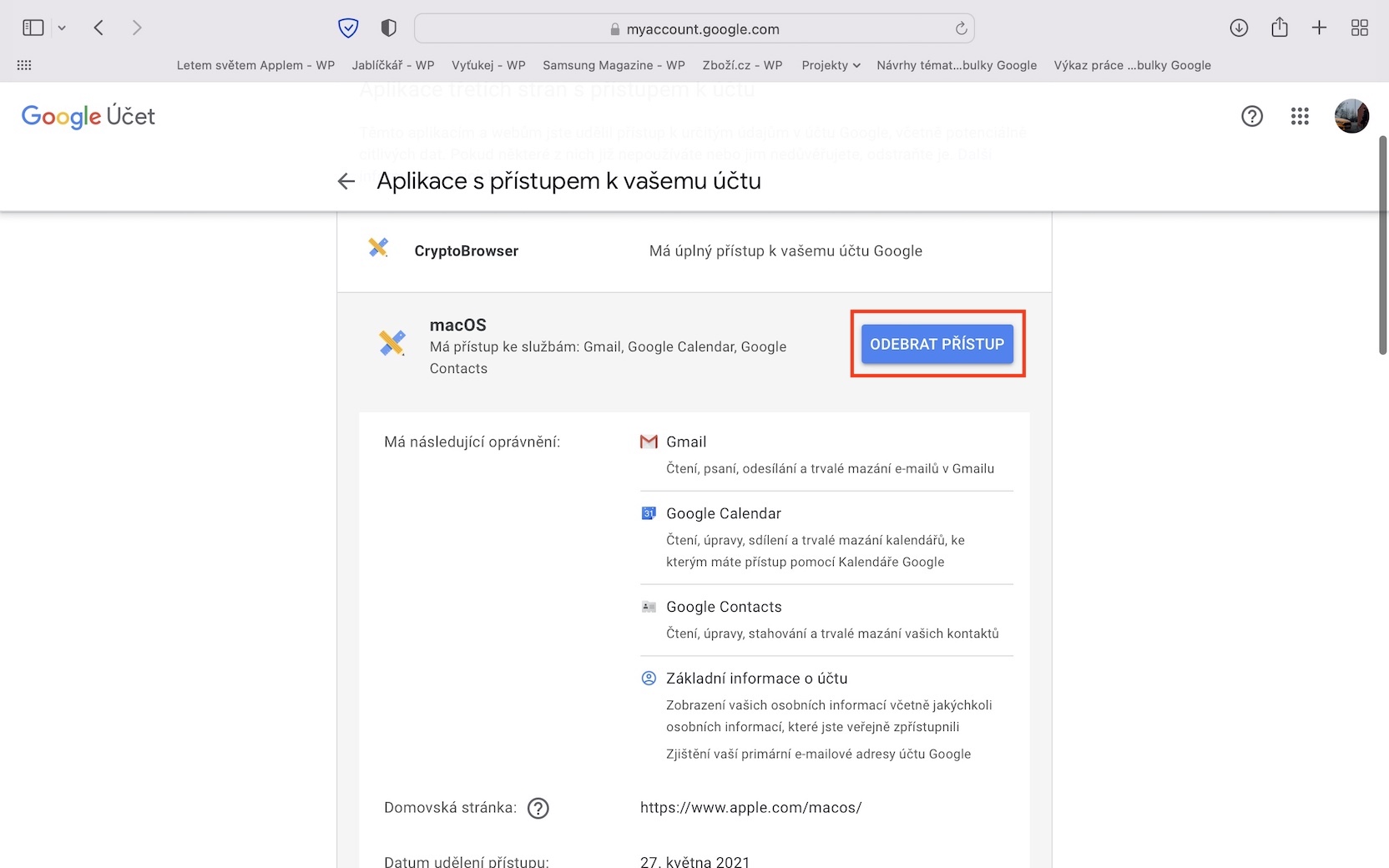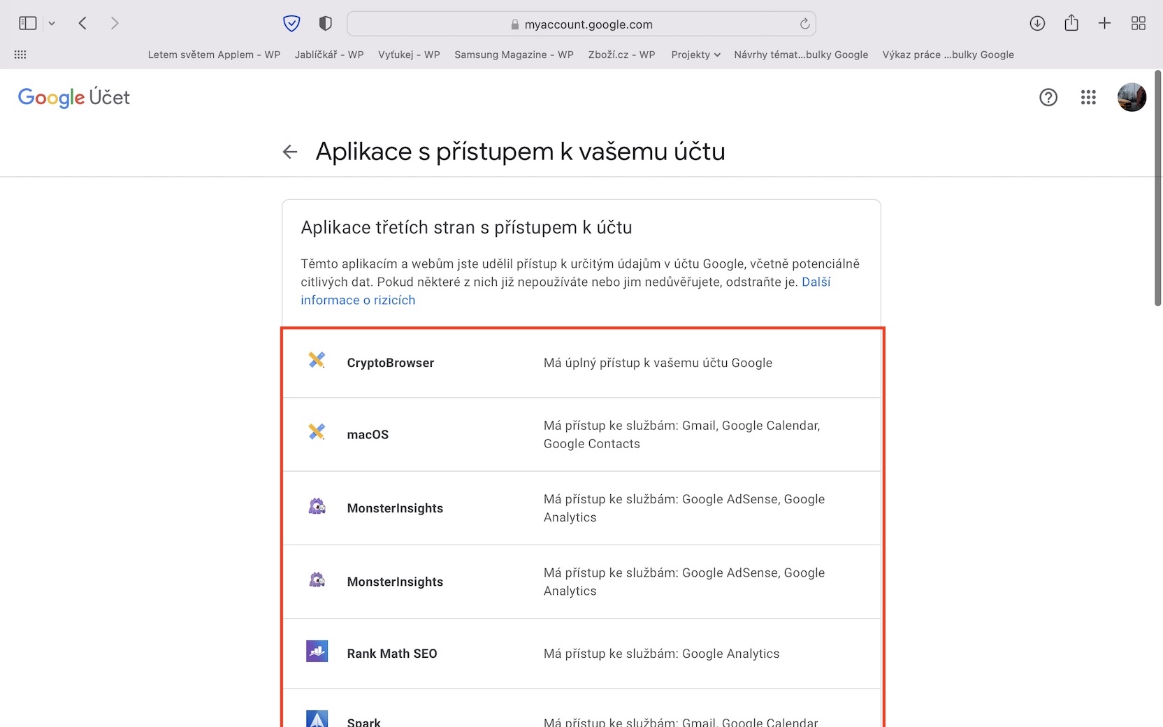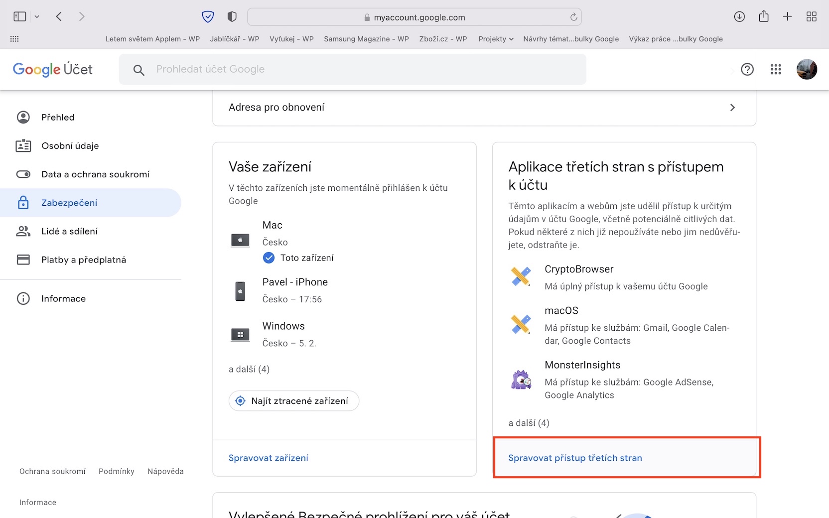 Všemožné aplikace a ostatní služby mohou se společností Google spolupracovat. Díky tomu se můžete k ostatním aplikacím a službám jednoduše přihlašovat s tím, že získají přístup k určitým datům, což samozřejmě prvně musíte povolit. Stejně jako v případě zařízení, na kterých jste přihlášeni, je nutné kontrolovat také aplikace a služby s přístupem k vašemu účtu, aby nedošlo k úniku dat či odcizení účtu. Toho docílíte tak, že přejdete na stránku Zabezpečení, a poté sjedete níže ke kategorii Aplikace třetích stran s přístupem k účtu, kde klepněte na Spravovat přístup třetích stran. Zobrazí se vám přehled veškerých aplikací a služeb, které mají přístup k vašemu účtu. Chcete-li přístup u některé aplikace či služby odebrat, tak na ni klepněte a stiskněte Odebrat přístup.