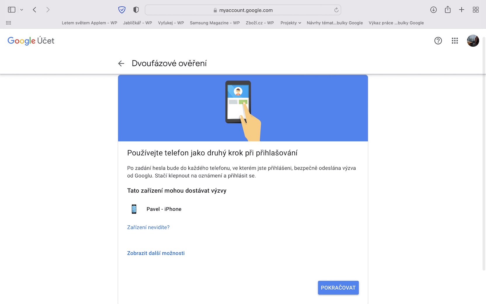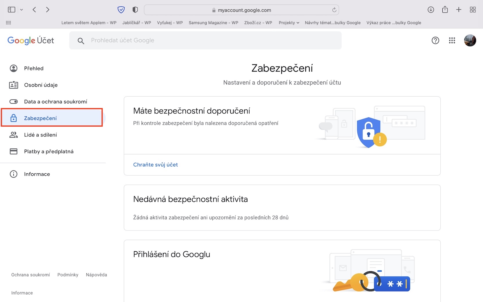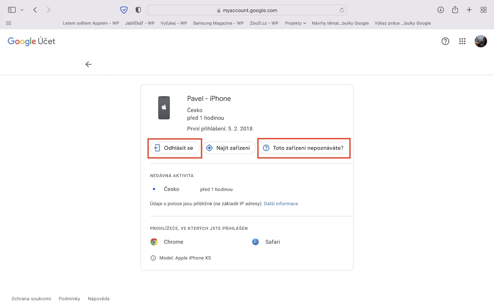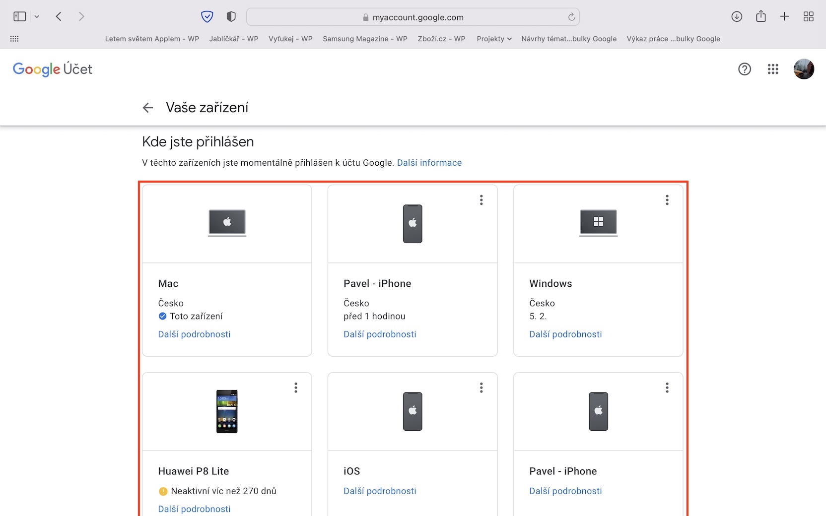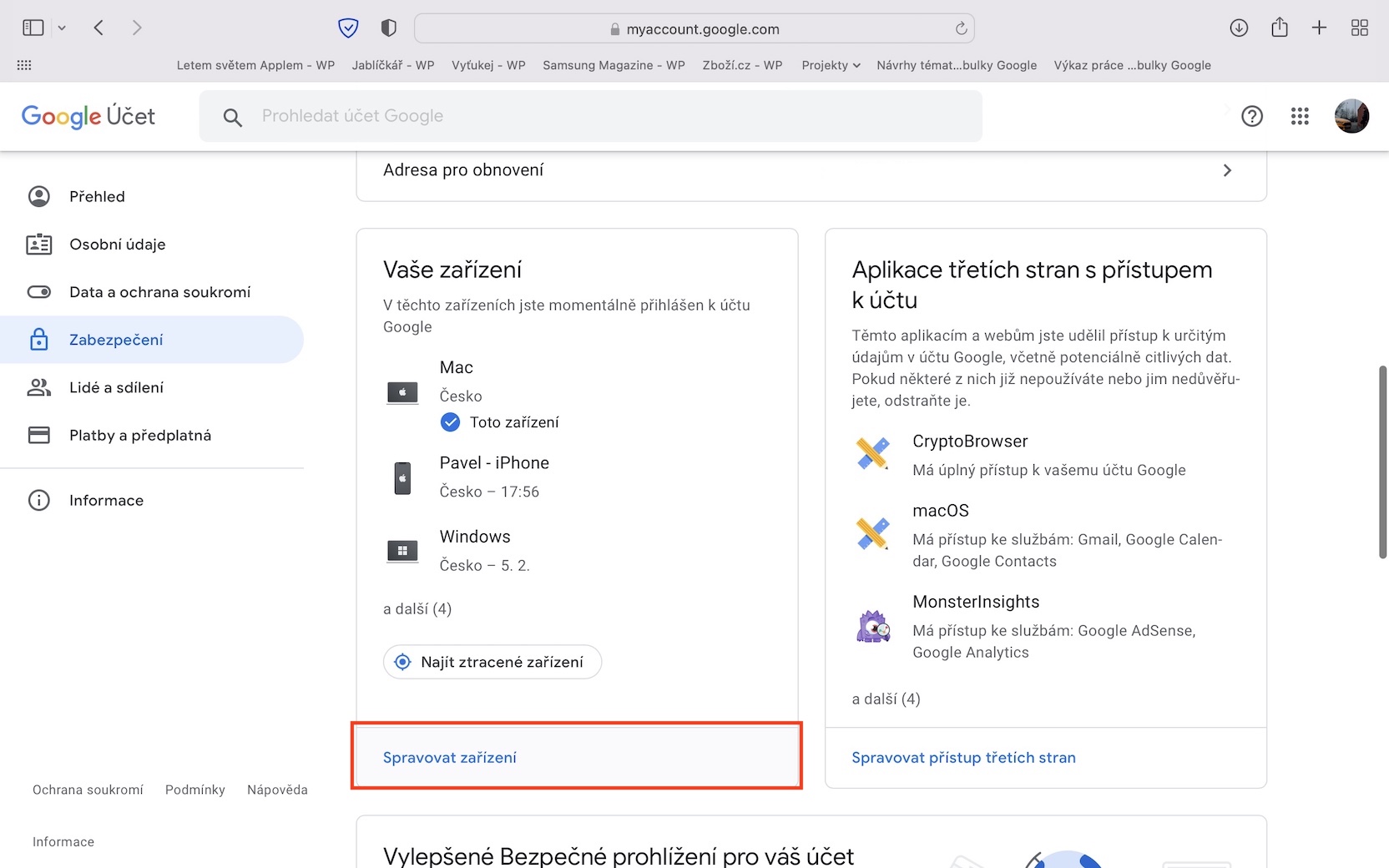 K vašim Google účtům se samozřejmě můžete přihlásit z vícero zařízení – například iPhonu, iPadu, Macu či jiného telefonu či počítače. Rozhodně je ale nutné zajistit, abyste měli přehled, na jakých zařízeních jste ke Google účtu přihlášeni. Pokud se například přihlásíte na veřejném počítači, tak při neodhlášení riskujete, že se vám někdo dostane do účtu. Pro kontrolu přejděte na stránku Zabezpečení, kde níže v kategorii Vaše zařízení veškerá zařízení najdete. Zde klepněte na možnost Spravovat zařízení. Pokud nějaké nerozpoznáváte, klepněte na něj a zvolte Odhlásit se, popřípadě Tohle zařízení nepoznáváte.