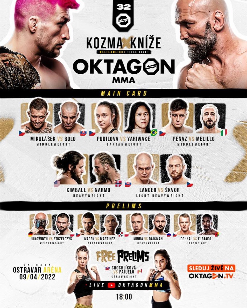 OKTAGON 32 živě by dnes měl běžet na obrazovce naprosto každého fanouška MMA. Po několikatýdenním půstu tu totiž máme další turnaj domácí organizace OKTAGON MMA, který se navíc svou startovkou jeví více než zajímavě. O jeho hlavní zápas se postará Kozma s Knížetem. Těšit se ale můžete třeba i na Mikuláška, Pudilovou, Peňáze, Kimbala či Jungwirtha. Zatímco předešlé hvězdně obsazené turnaje včetně toho, na kterém se utkal Vémola s Véghem, byly vysílány mimo jiné na O2 TV Sport v Česku a na JOJ Plus na Slovensku, posledních několik turnajů včetně toho dnešního ve formě OKTAGON 31 běží jen na dvou platformách – konkrétně na OKTAGON.tv skrze Pay per view a na Tipsportu.