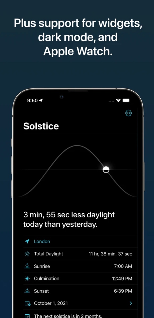 Solstice je multiplatformní a skvěle vypadající aplikace, kterou jistě ocení všichni, kteří se zajímají o údaje související s východem a západem slunce, slunovraty, a kteří se neobejdou bez informací o míře denního světla ve své lokalitě. Solstice pro Apple Watch nabízí přehledné zobrazení všech zmíněných informací spolu s notifikacemi a dalšími funkcemi.
