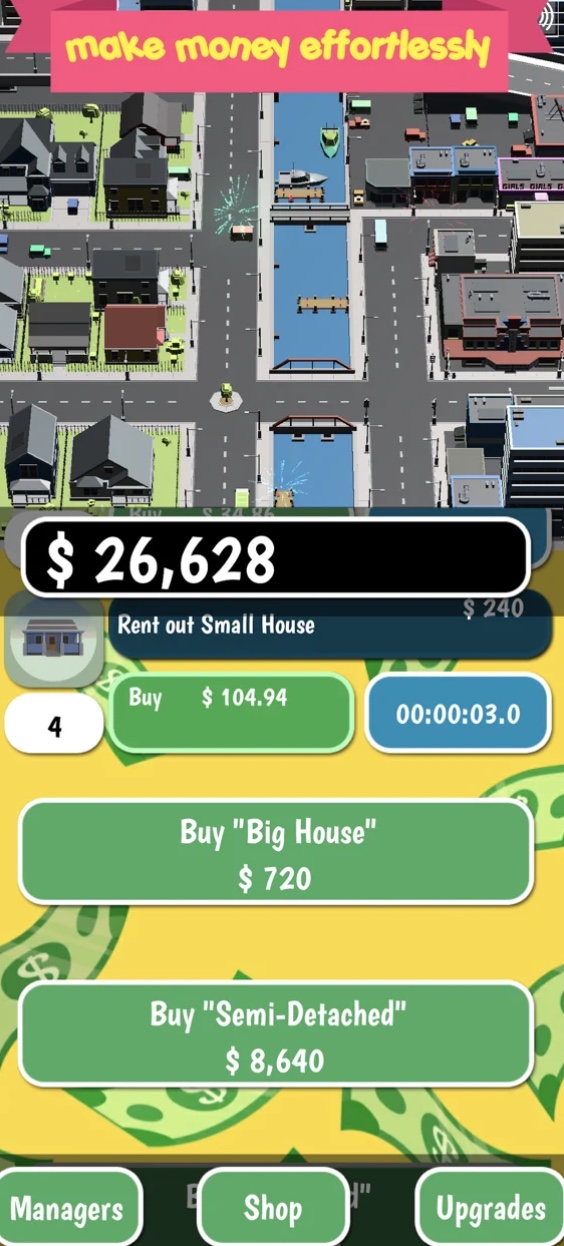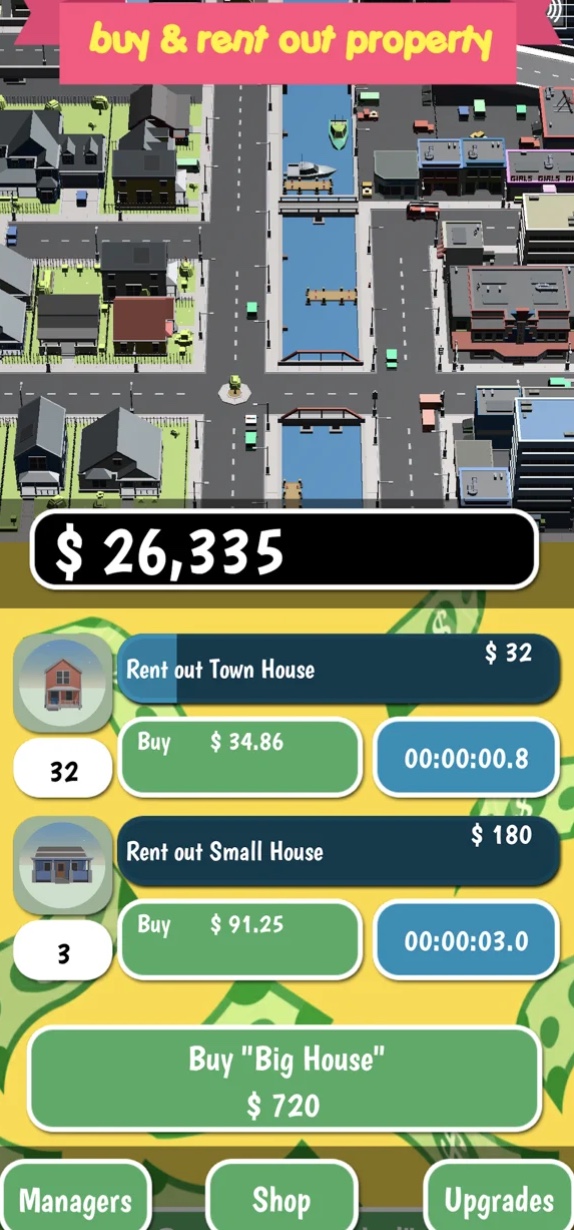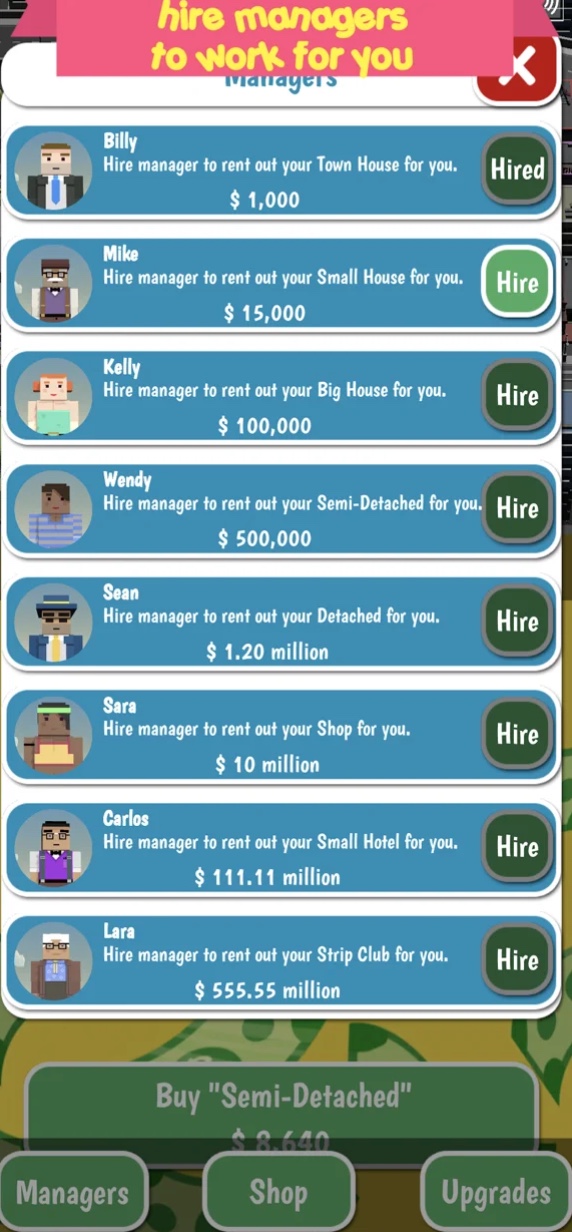 Stažením aplikace Rent Business Tycoon Game si přijdete na poměrně zajímavou hru, ve které se budete pokoušet o vybudování vlastního byznysu. Konkrétně se budete zajímat o svět nemovitostí. Postupně ale budete získávat další a další nemovitosti, které už jeden člověk nedokáže sám spravovat. Přesně z tohoto důvodu si následně na pomoc vezmete vlastní manažery.