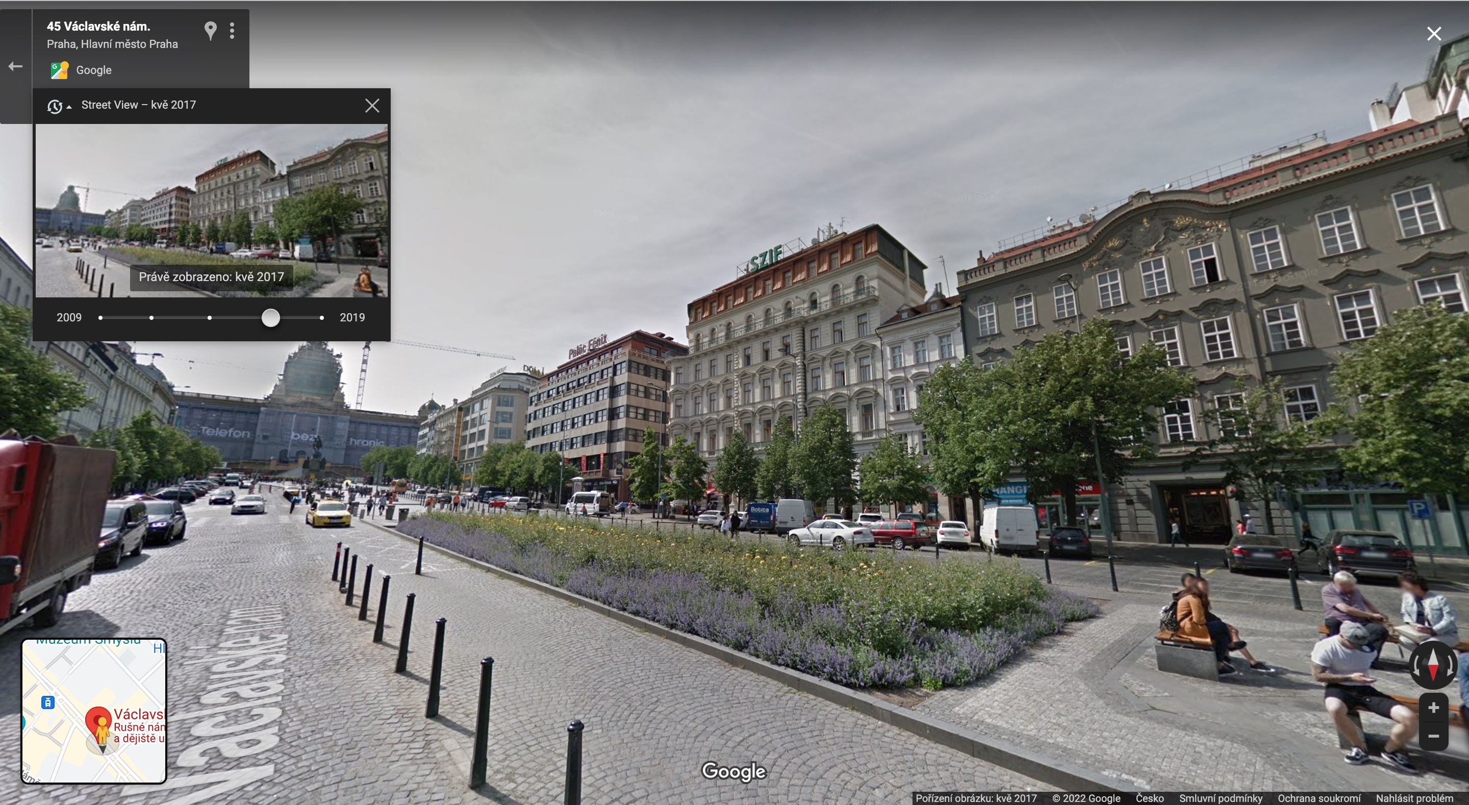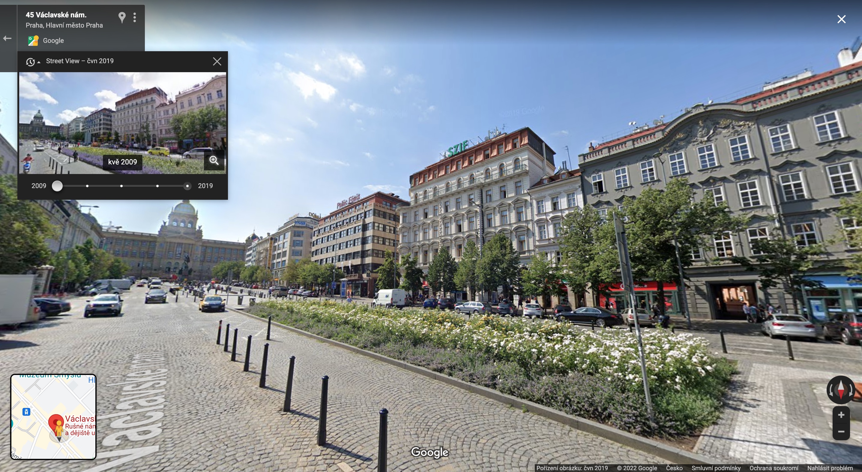 Pokud si rádi prohlížíte vybrané lokace v režimu Street View, možná vás potěší i možnost zobrazení starších záběrů tohoto typu. Nejprve vyhledejte místo, které si chcete prohlédnout. Z pravého dolního rohu přetáhněte ikonku panáčka na místo tak, abyste přešli do režimu StreetView. Nakonec stačí v okně v levém horním rohu kliknout na ikonku hodin a vybrat požadované období. Upozorňujeme, že tuto možnost lze využít jen na vybraných místech.