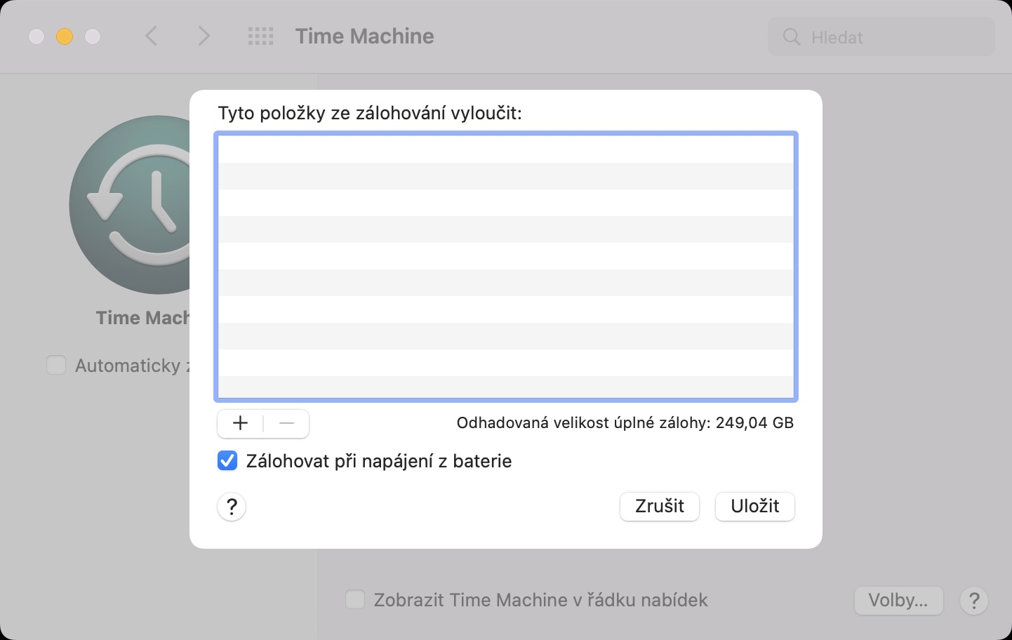 Pomocí výše uvedeného postupu je tedy možné na vašem Macu aktivovat zálohování přes Time Machine i v případě, že nemáte jablečný počítač připojený k síti a dochází k napájení skrze baterii. Jak už ale bylo zmíněno výše, tak je nutné počítat s tím, že při zálohování Time Machine bude docházet k rychlejšímu vybíjení baterie, jelikož se jedná o náročný proces. Ve výše uvedené sekci si pak ještě můžete vybrat soubory, které chcete ze zálohování vyloučit, zároveň se zde nachází i informace o odhadované velikosti zálohy.