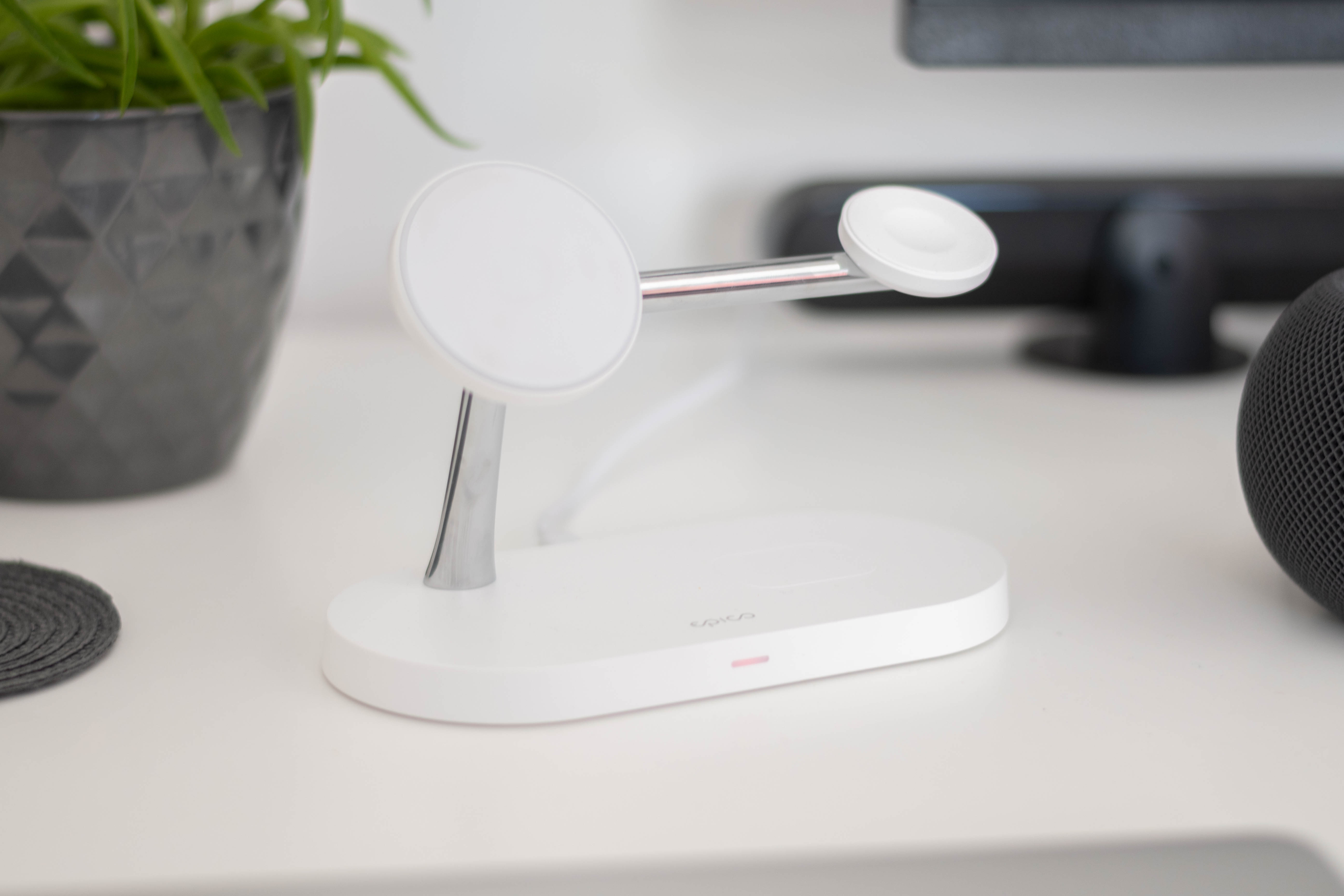 Nabíječka je tvořená z ramena z nerezové oceli, které je ukotveno v podélné podestě a které drží výše zmíněnou nabíjecí kruhovou plochu pro nabíjení smartphonu spolu s magnetickým pukem pro Apple Watch. V podestě je pak umístěna cívka pro nabíjení AIrPods. Zajímají-li vás barvy, nabíječka je k dispozici v bílé a černé barevné variantě. Krom dvou barevných variant je pak pozitivem i napájecí adaptér v balení, který není u bezdrátových nabíječek v žádném případě standardem. K jeho propojení s nabíječkou slouží taktéž přibalený USB-C kabel.