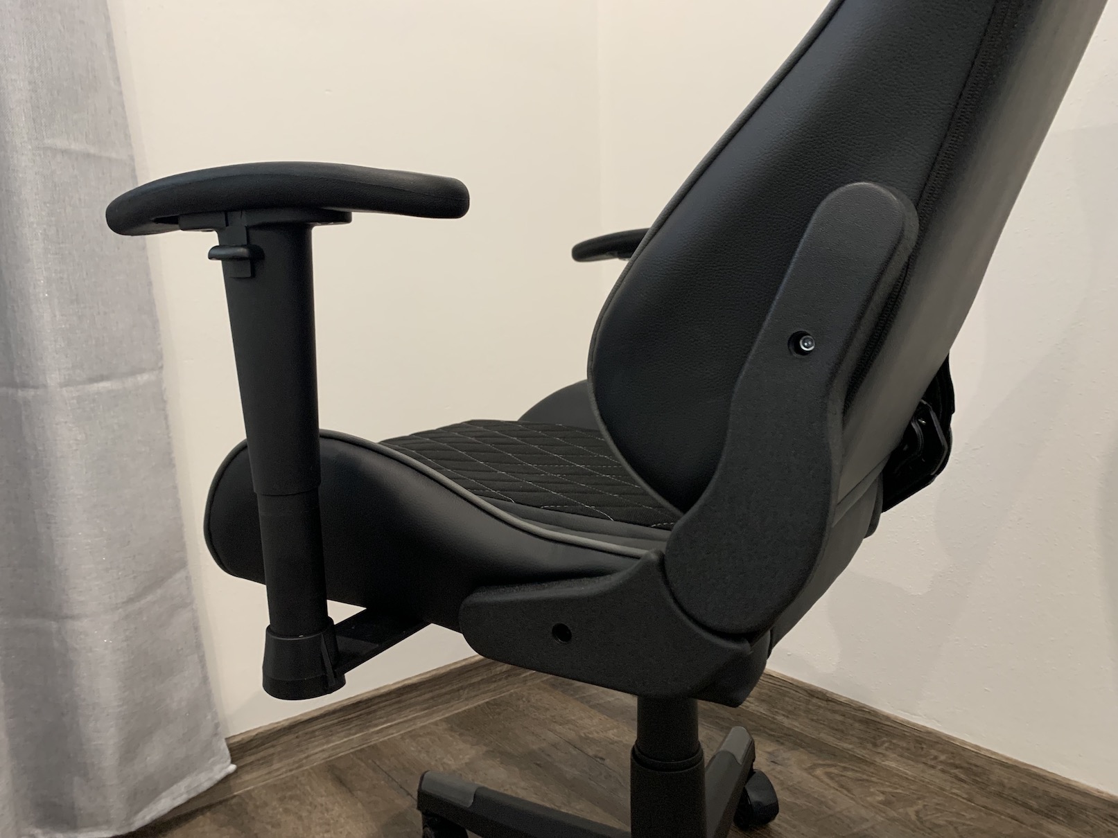 Co se pak týče prvních chvílí po složení, tak upřímně jsem byl celkem skeptický. Židle se mi oproti mé staré zdála relativně malá a nebyl jsem si jistý tím, zdali mi bude pohodlná. Stačilo však, abych si ji během 15 minut nastavil podle svých potřeb a následně už jsem si jen říkal, že jsem opravdu provedl dobrou koupi. Židle je pro mne (175 cm a necelých 80 kg) velikostí naprosto ideální, nutno ale zmínit, že objemnějším jedincům by mohl dělat problém užší sedák, který je pro mne tak akorát velký. Délka sedáku mi pak taktéž naprosto vyhovuje. Jak samotný sedák, tak opěrná část je příjemně měkká, takže se na židli sedí moc pohodlně. Ihned jsem si také zamiloval design a využité materiály, kdy uprostřed se nachází prošívaná látka a po bocích koženka. Samozřejmostí je pak možnost změny výšky, přizpůsobitelné jsou pak i opěrky rukou, u kterých lze taktéž změnit výšku, a dokonce je můžete i otočit dovnitř či ven. Zásadní pro mě bylo to, aby židle nijak nevrzala a nevydávala zvuky, jelikož jsem na to doslova a zcela upřímně alergický. Ani to se naštěstí neprojevilo, celkovou kvalitu však ale samozřejmě ukáže až čas.