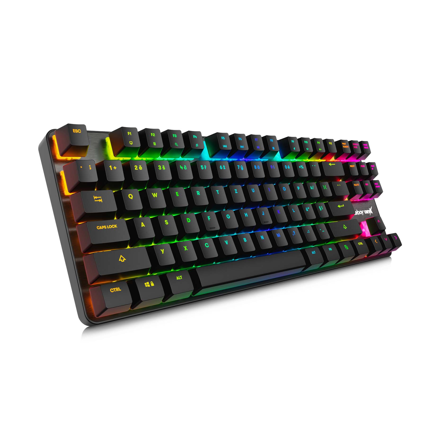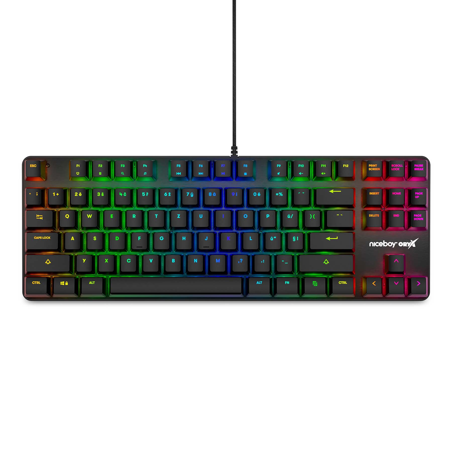 Niceboy ORYX K500X je navržena v populárním TKL (tenkeyless) designu. Ten neobsahuje numerický blok, takže ponechává větší prostor pro efektivnější pohyb myši bez omezení. Na těle klávesnice Niceboy K500X najdete 87 nejpoužívanějších kláves s vysokým zdvihem. Klávesnice ORYX K500X má rám z broušeného hliníku, což zvyšuje její životnost. Bytelná stavba klávesnice navíc nabízí dobrou stabilitu klávesnice na stole.