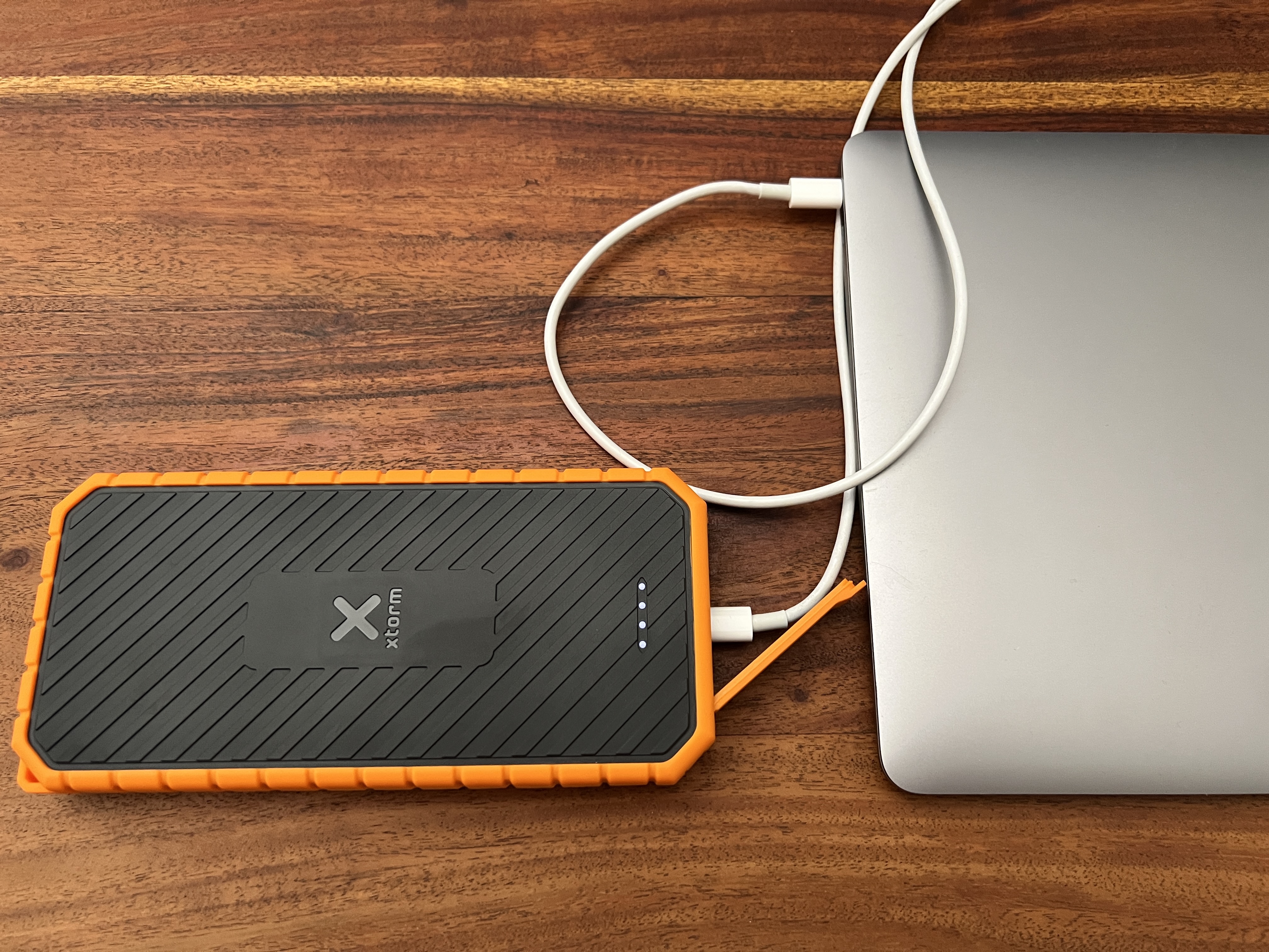 Tím se dostáváme k tomu, co mě baví na této powerbance nejvíc. MacBook Air se napájí pomocí 30W USB-C adaptéru, který k němu dostanete. Výstupní proud Xtorm Rugged je 30W přes USB-C a můžete s ní nabíjet MacBook Air stejně rychle, jako s přiloženým adaptérem. Zde však sranda nekončí, kapacita baterie v aktuálním MacBook Air je 5100 mAh, přičemž kapacita recenzované powerbanky je 20 000 mAh. I když odečtu veškeré ztráty, tak mohu nabít MacBook z nuly na sto procent hned třikrát, teoreticky pak 3,5x, ovšem dejme tomu, že skutečně „jen“ třikrát. Prohlížení webu zvládne MacBook Air podle Applu, a i podle nás při stoprocentně nabité baterii neskutečných 15 hodin. Pokud tedy vyrazíte někam s plně nabitou Powerbankou Xtorm Rugged a plně nabitým MacBookem Air, můžete na něm pracovat neskutečných 60 hodin bez toho, aniž byste museli využívat zásuvku. Když byste pracovali klasických 8,5 hodin denně, pak můžete pracovat sedm dní! Samozřejmě nesmíte renderovat 4K video, ovšem při kancelářské práci vám skutečně vydrží MacBook Air na jedno nabití i déle jak 15 hodin a teď si představte, že můžete vyrazit na týden kamkoli na světě, kam si jen vzpomenete a 8,5 hodiny pracovat každý den bez toho, aniž by vám došla šťáva! To už je argument, proč se Rugged od Xtormu opravdu vyplatí a proč jsem si jednu také pořídil.