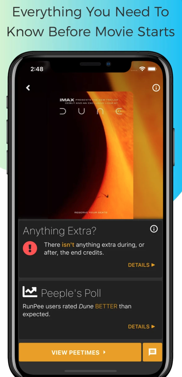 Aplikace RunPee možná může na první pohled působit mírně bizarně, užitečnost se jí ale rozhodně nedá upřít. V této aplikaci najdete velice obsáhlý seznam filmů všech možných žánrů a stáří, u kterých zároveň naleznete informaci o tom, ve které chvíli je nejvhodnější si od filmu odskočit, aby vám neunikly žádné důležité momenty. Aplikace RunPee vám pomůže zjistit i další detaily o vámi vybraných filmech, jako je například vysvětlení počátku děje pro případ, že byste k filmu dorazili pozdě, nebo třeba to, zda se můžete po závěrečných titulcích těšit na nějaké překvapení.