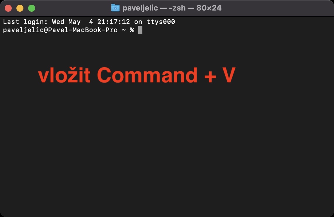 - Jakmile Terminál otevřete, tak se do něj přesuňte a zkopírovaný příkaz zde vložte.