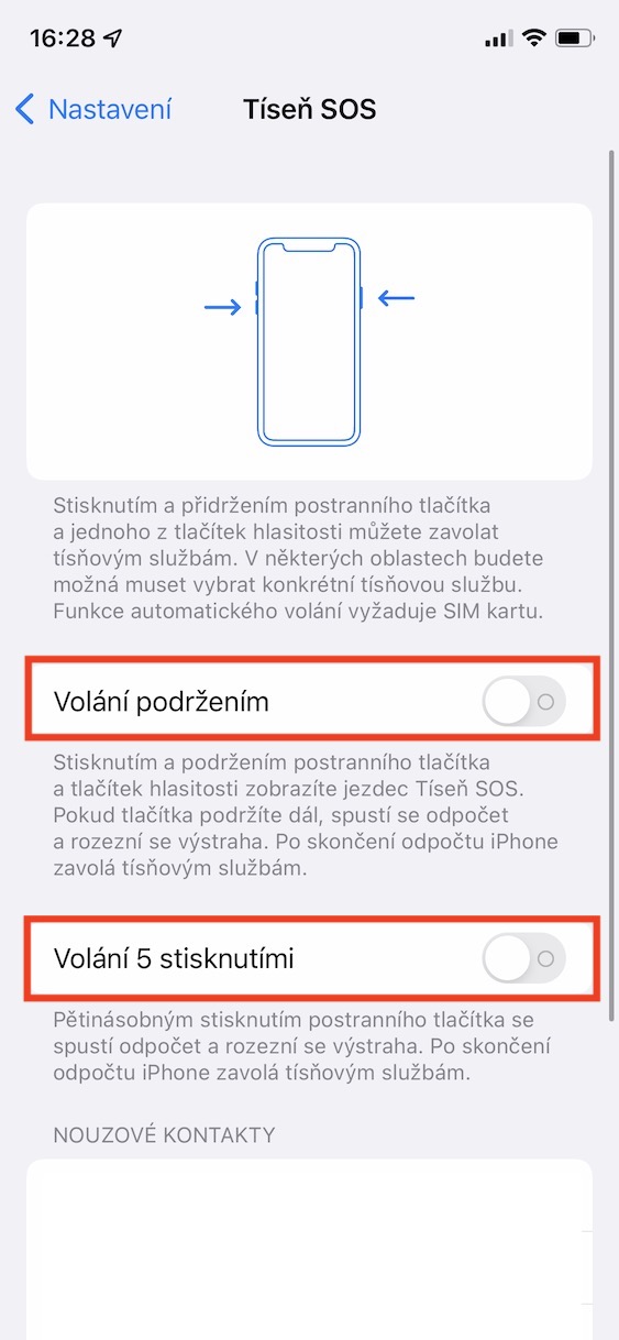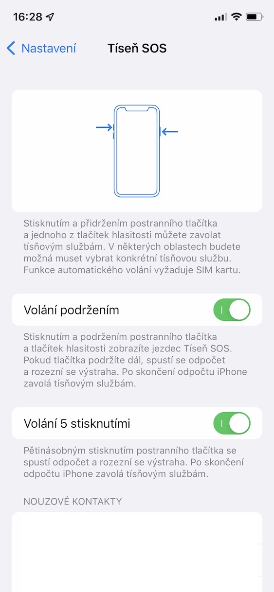 Kdykoliv se ocitnete v nějaké krizové situaci, tak můžete váš iPhone využít k tomu, abyste zavolali na tísňovou linku. Tíseň SOS lze vyvolat několika různými způsoby. Můžete například přejít na obrazovku pro vypnutí iPhonu, zde stačí přejet prstem po posuvníku tísně SOS. Popřípadě lze ale vyvolat tíseň SOS také pomocí bočního tlačítka, a to buď jeho pětinásobným stisknutím, anebo podržením. Tuto funkci lze aktivovat v Nastavení → Tíseň SOS, kde aktivujte Volání podržením či Volání 5 stisknutími.