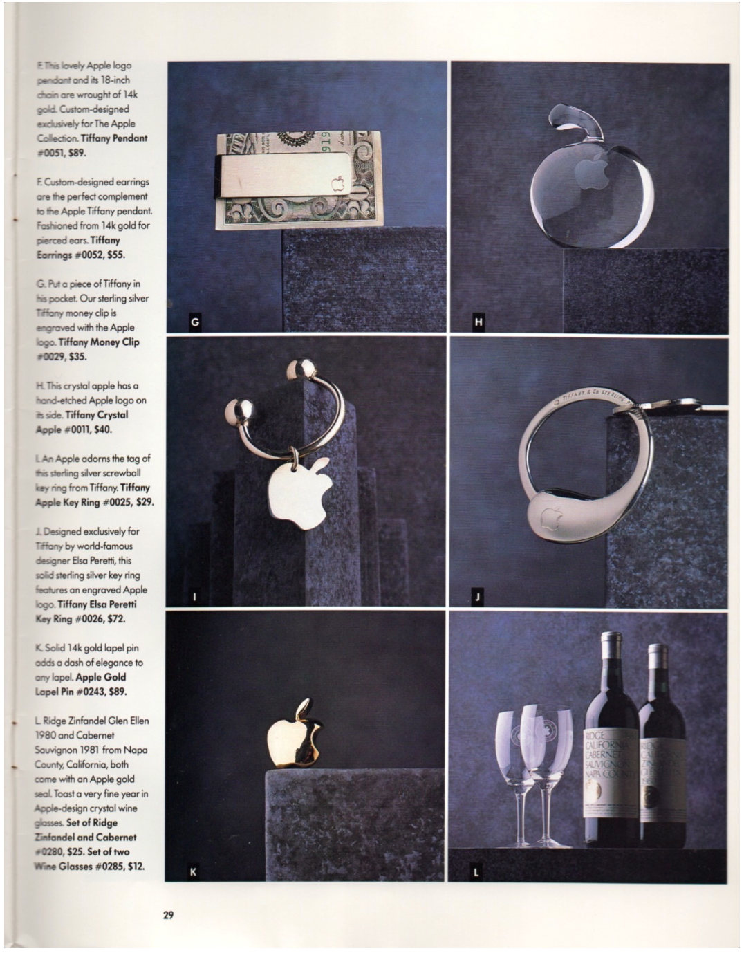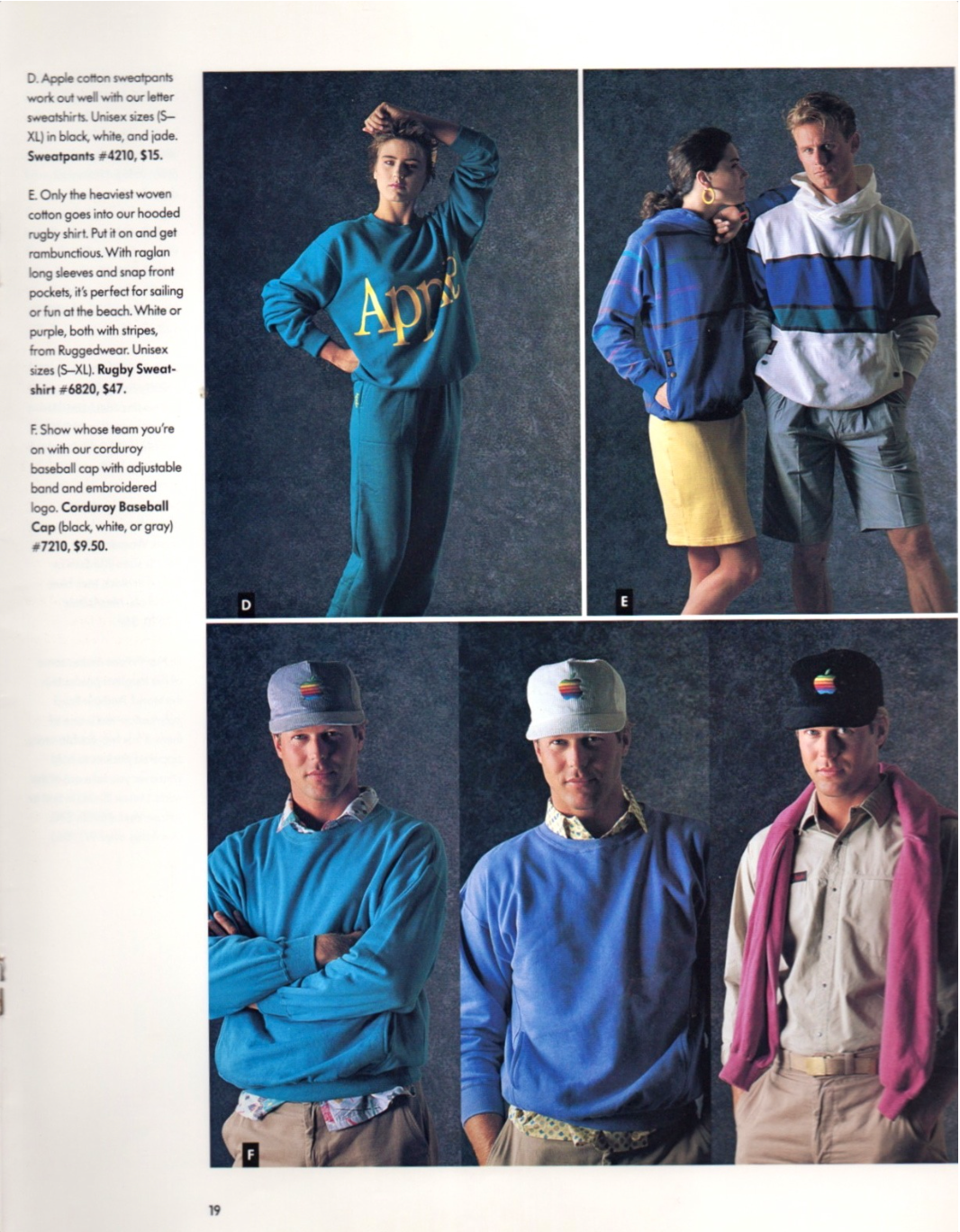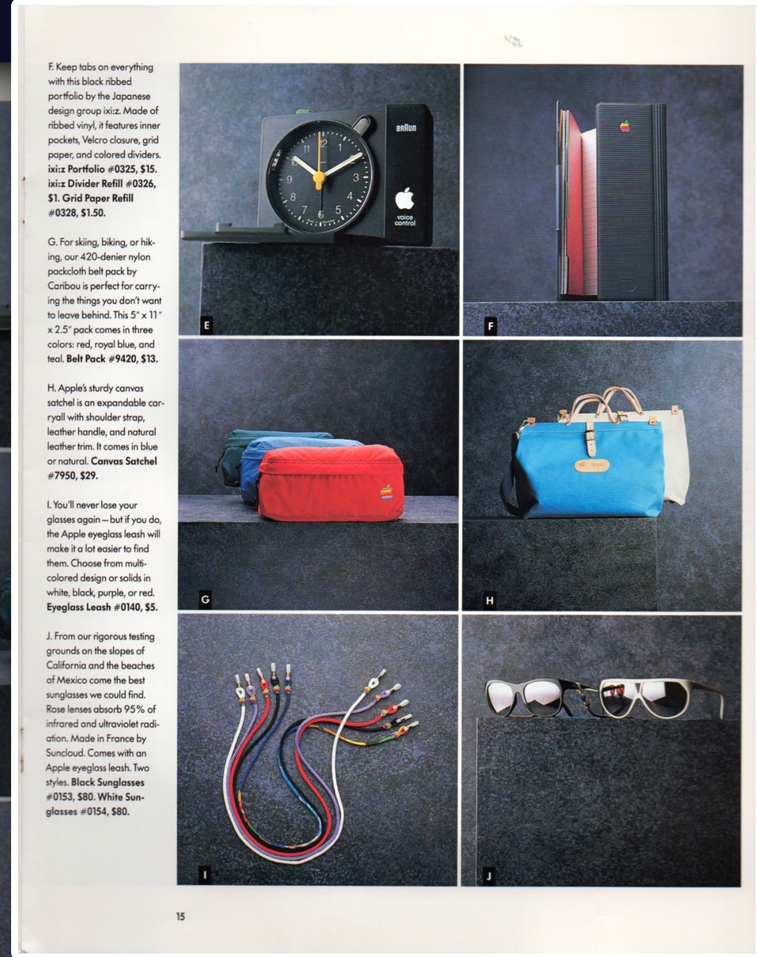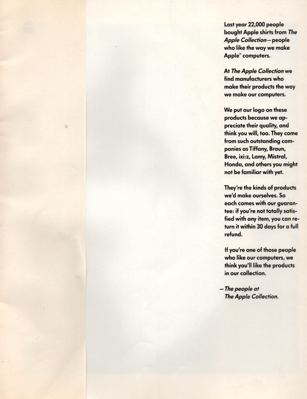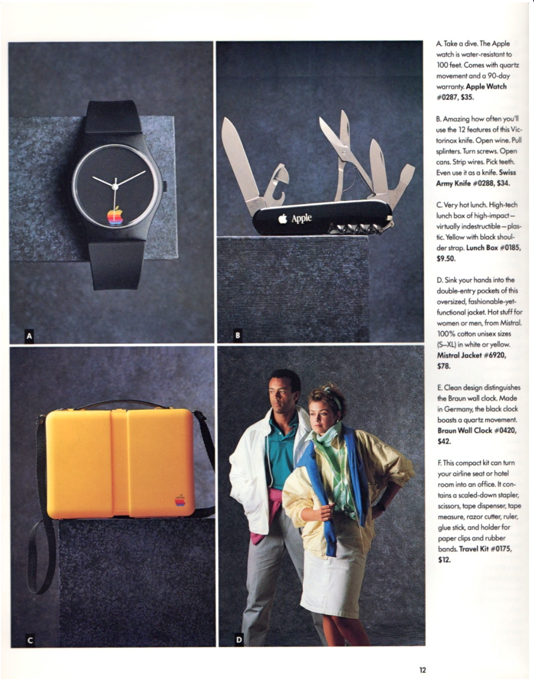 Apple se se svou kolekcí rozhodně nehodlal držet při zemi, a svým logem opatřil i méně tradiční předměty, jakou byla třeba plachta na windsurfing, skládací židlička, náramkové hodinky nebo například sada šňůrek na brýle. Součástí kolekce se ale staly také lahve, půllitry nebo třeba termosky. Veškeré předměty z Apple Collection získaly také svůj obsáhlý katalog. Papírové katalogy byly v té době u řady firem naprosto běžnou záležitostí, a lidé jimi často s oblibou listovali. V době, kdy Apple Collection vyšla, byste pochopitelně jeho online verzi nejspíš hledali marně.