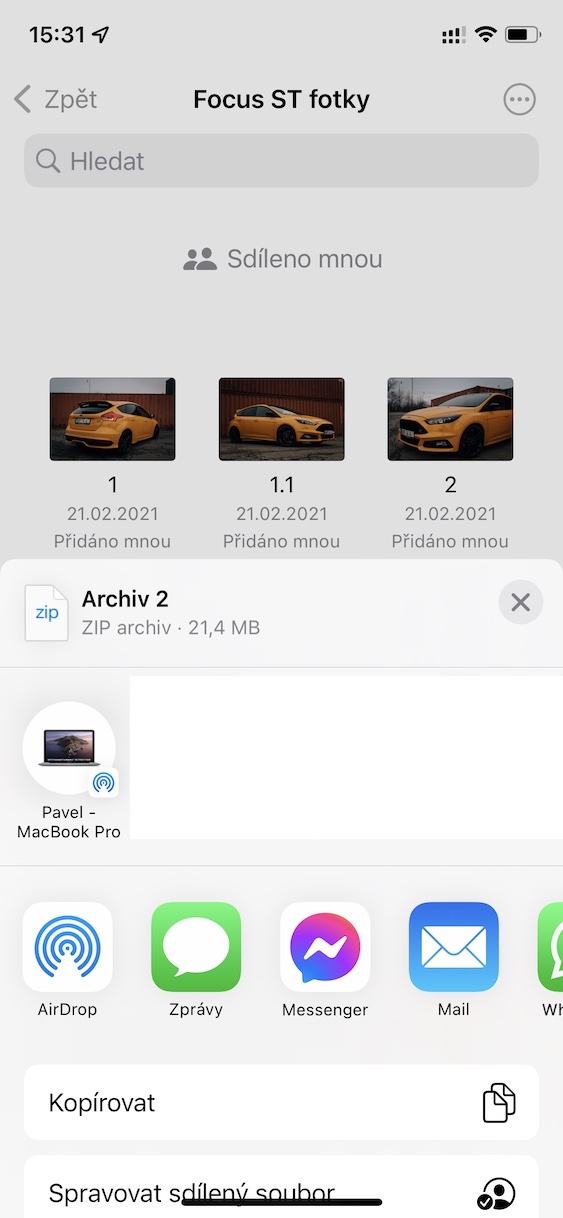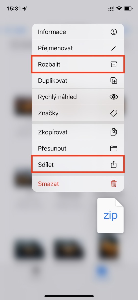 Pomocí výše uvedeného postupu se tedy ihned vytvoří komprimovaný archiv ve formátu ZIP, ve kterém se skrývají veškerá označená data. Tento soubor pak můžete jednoduše kamkoliv sdílet, popřípadě s ním můžete dalšími způsoby pracovat. Kromě sdílení lze samozřejmě ZIP archiv také přenášet mezi úložišti a případně si jej můžete přenést i na iCloud, díky čemuž jej budete mít k dispozici na všech vašich zařízeních. Pro sdílení archivu na něm stačí podržet prst a zvolit Sdílet, pokud byste jej chtěli rozbalit, tak stiskněte možnost Rozbalit, což se může hodit u stažených ZIP archivů.