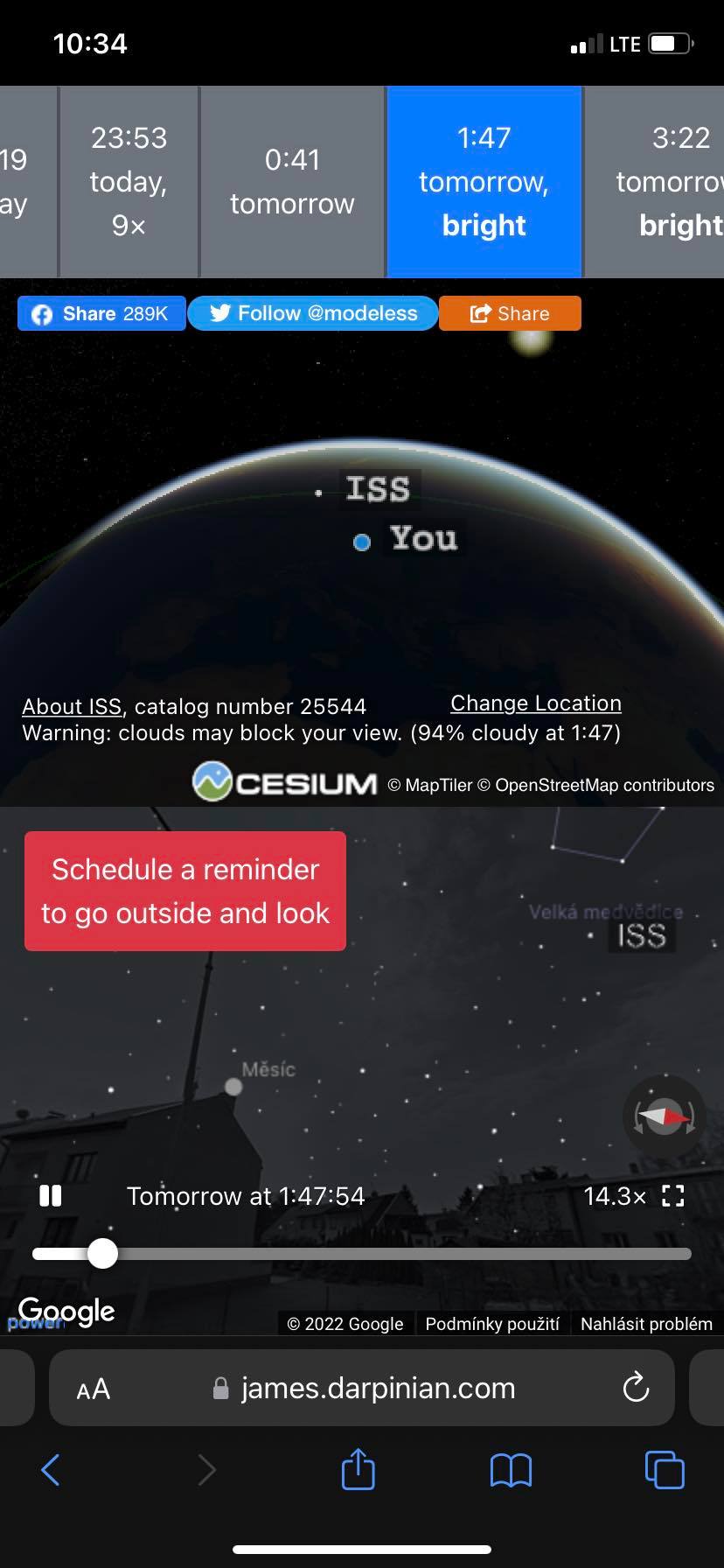 Její použití je více než snadné. Po jejím otevření klikněte na plochu a povolte polohové služby. Následně v horní části obrazovky můžete vidět výčet satelitů, které kolem vás proletí. Taktéž jsou označeny ty, které budou vidět. Přes den samozřejmě neuvidíte nic a v noci se může stát, že budou kryty stínem naší planety. Pod výčtem satelitů si lze všimnout mapy Země z vesmíru pro lepší orientaci. Naprosto nejlepším řešením je ale mapka níže, v níž díky polohovým službám vám web ukáže dokonce místo, kde se nacházíte, a relativně přesné místo, kudy přesně satelit po obloze proletí. Dnes v 1:01 jsem takhle úspěšně sledoval průlet Mezinárodní vesmírné stanice (ISS). Další možnost je zítra v 1:47. Pochopitelně je možné takto sledovat i třeba satelity Starlink. Ve výše uvedené mapce pak často narazíte i na odkazy na wikipedii, kde se o konkrétním satelitu dozvíte více informací. Grafickou podobu appky můžete vidět v galerii na boku odstavce.