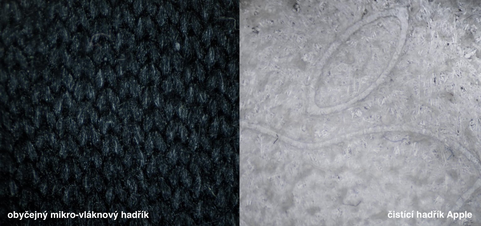 Pokud se podíváte na detail čistícího hadříku od Applu přímo na Online Store, tak zjistíte, že je zde definován jakožto měkký čisticí hadřík z neabrazivního materiálu, kterým bezpečně a účinně očistíte jakýkoli displej Apple včetně skla s nanotexturou. Mnoho jedinců po představení tohoto čistícího hadříku uvedlo, že se v ničem neliší od klasické mikro-vláknové utěrky. Opak je však pravdou, jelikož rozlišnosti jsou rozhodně znát, a to jak na první pohled a omak, tak hlavně pod mikroskopem, kde si lze okamžitě všimnout prémiové kvality. Vlákna jsou zde navzájem propletena zvláštním způsobem, což zajišťuje lepší čistící vlastnosti. Na omak jinak čistící Apple hadřík připomíná Alcantaru, byť se samozřejmě jedná o jiný materiál.