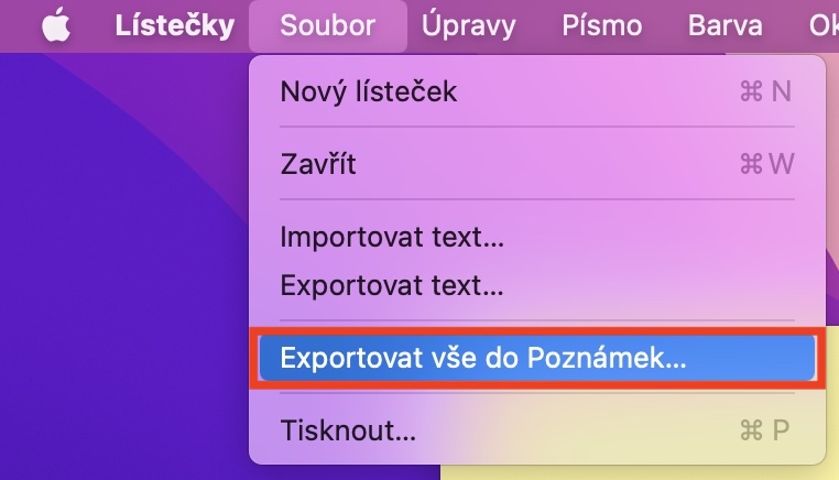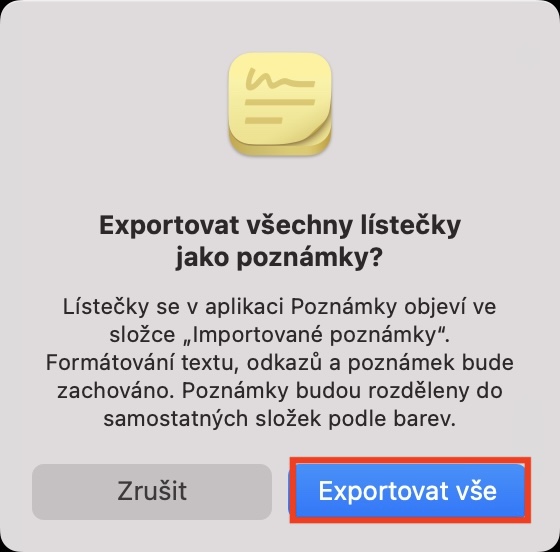 V poslední době se už několikrát zobrazily zprávy o tom, že by měl Apple v některé z dalších aktualizací systému macOS aplikaci Lístečky kompletně odstranit, a to právě z toho důvodu, jelikož má ještě lépe tuto funkci zastávat nativní aplikace Poznámky. Pokud k tomu dojde, bude mě to samozřejmě velmi mrzet. Abyste však o lístečky nepřišli, tak si je můžete jednoduše exportovat do Poznámek. Toho docílíte tak, že v horní liště klepnete na záložku Soubor, a poté z menu vyberete Exportovat vše do Poznámek. V dialogovém okně pak klepněte na Exportovat vše. Lístečky se v Poznámkách objeví v kategorii Importované poznámky.