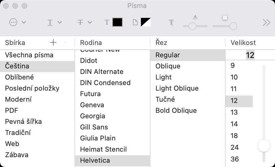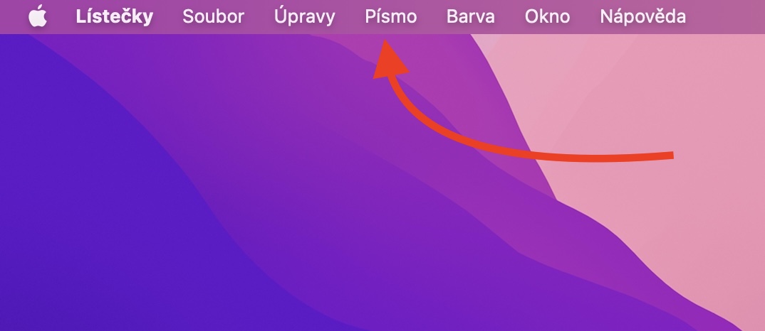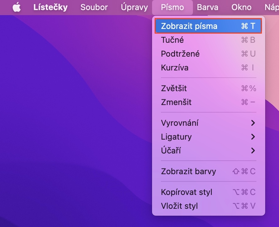 V rámci jednotlivých lístečků si pak můžete nastavit i písmo. Pokud byste chtěli nějaké písmo udělat tučné, podtržené či kurzívou, tak můžete využít klávesové zkratky Command + B, U či I. Jestliže zkratky nemáte v lásce, stačí text označit, a poté klepnout v horní liště na záložku Písmo a styl si vybrat. Jakmile na záložku Písmo klepnete, tak si rovnou můžete zobrazit také další možnosti, a to například pro zvětšení či zmenšení. Klepnutím na Zobrazit písma se vám pak otevře nové okno, ve kterém si nastavíte písmo pro konkrétní lísteček.