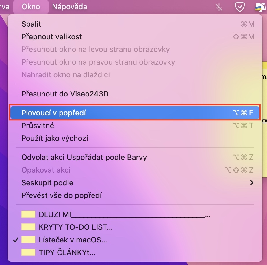 Lístečky jsou automaticky umísťovány do pozadí. Dá se říct, že jsou jednoduše přilepeny na ploše, odkud se nehnou, aby vám nepřekážely – neučiníte-li jinak. Samozřejmě, pokud se budete nacházet v nějaké aplikaci, a poté na lísteček klepnete, tak se přesune do popředí. Nastavit si ale můžete také to, aby se konkrétní lísteček nacházel vždy v popředí. Díky tomu budete schopni s lístečkem pracovat a nechat si jej zobrazený, zatímco například budete využívat internet či jakoukoliv jinou aplikaci. Pro přemístění lístečku do popředí se do něj přesuňte, a poté v horní liště klepněte na Okno → Plovoucí v popředí. Neustále zobrazení v popředí pak stejným způsobem také deaktivujete.