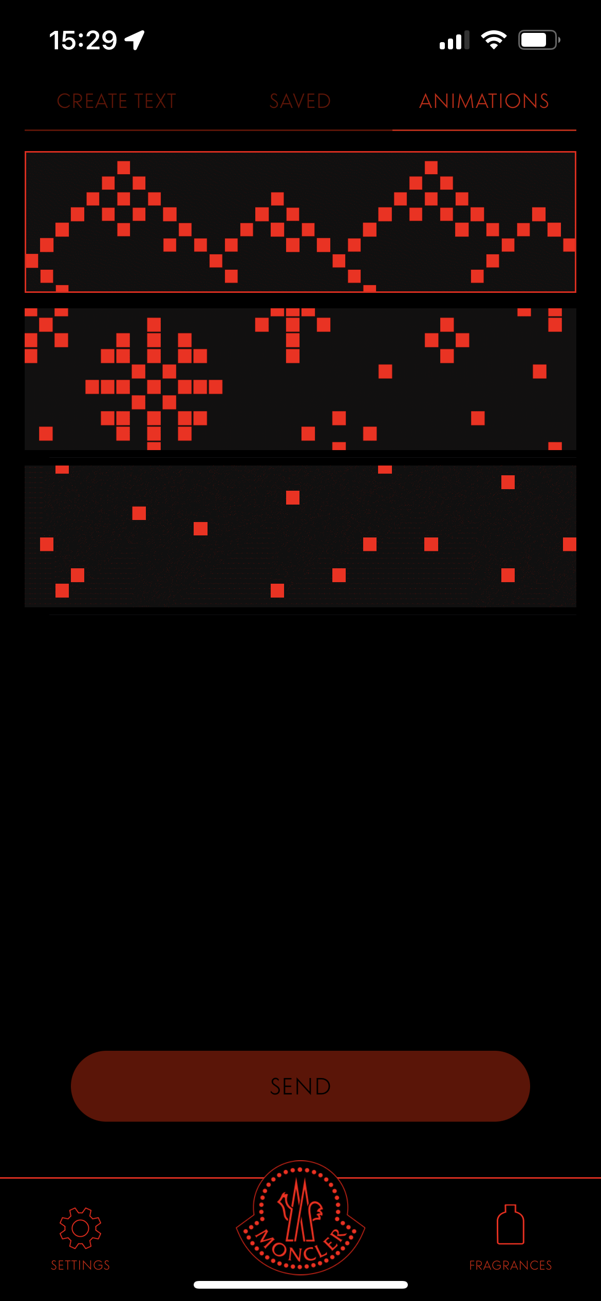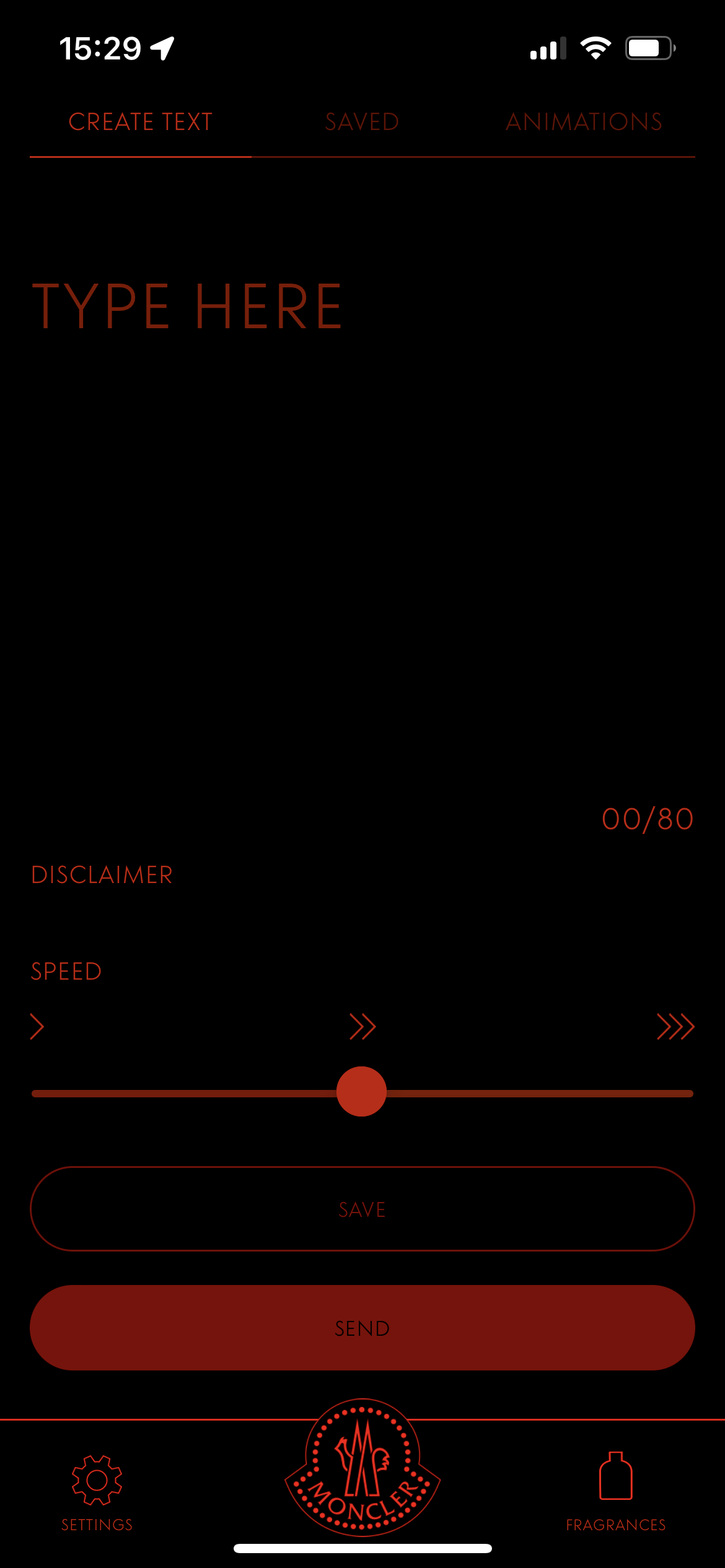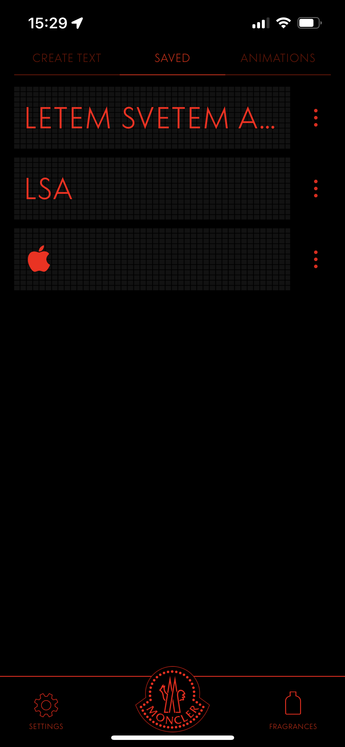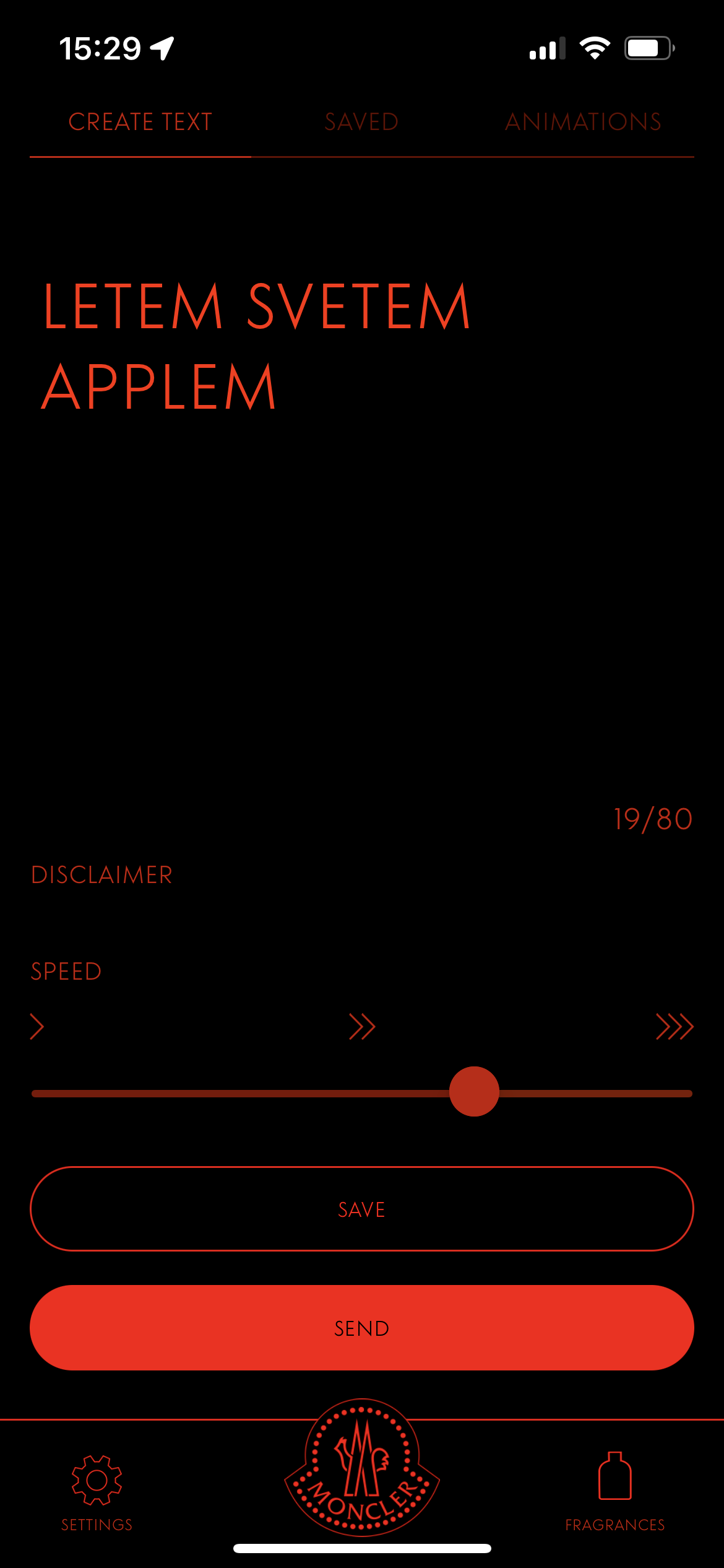 Flakon se připojuje k iPhone pomocí Bluetooth a k jeho ovládání slouží aplikace Moncler Parfum, kterou si stáhnete v App Store. Zde bych rád podotkl, že zpracování samotné aplikace odpovídá faktu, jaká společnost za ním stojí a vývojáři si dali opravdu záležet na tom, aby vše vypadalo dokonale. Aplikace vám umožňuje připojit se k flakonu a následně do něj nahrát vlastní text, určit rychlost promítání textu nebo nahrávat různé symboly. Máte možnost ovládat více flakonů a přepínat mezi nimi jak je libo. Můžete také měnit strany, ze kterých se text promítá, editovat uložené texty a tak dále. Na to, o jakou blbost se jedná, je až k nevíře, jak moc práce si s ní vývojáři dali. Můžete používat i emoji nebo například logo společnosti Apple.