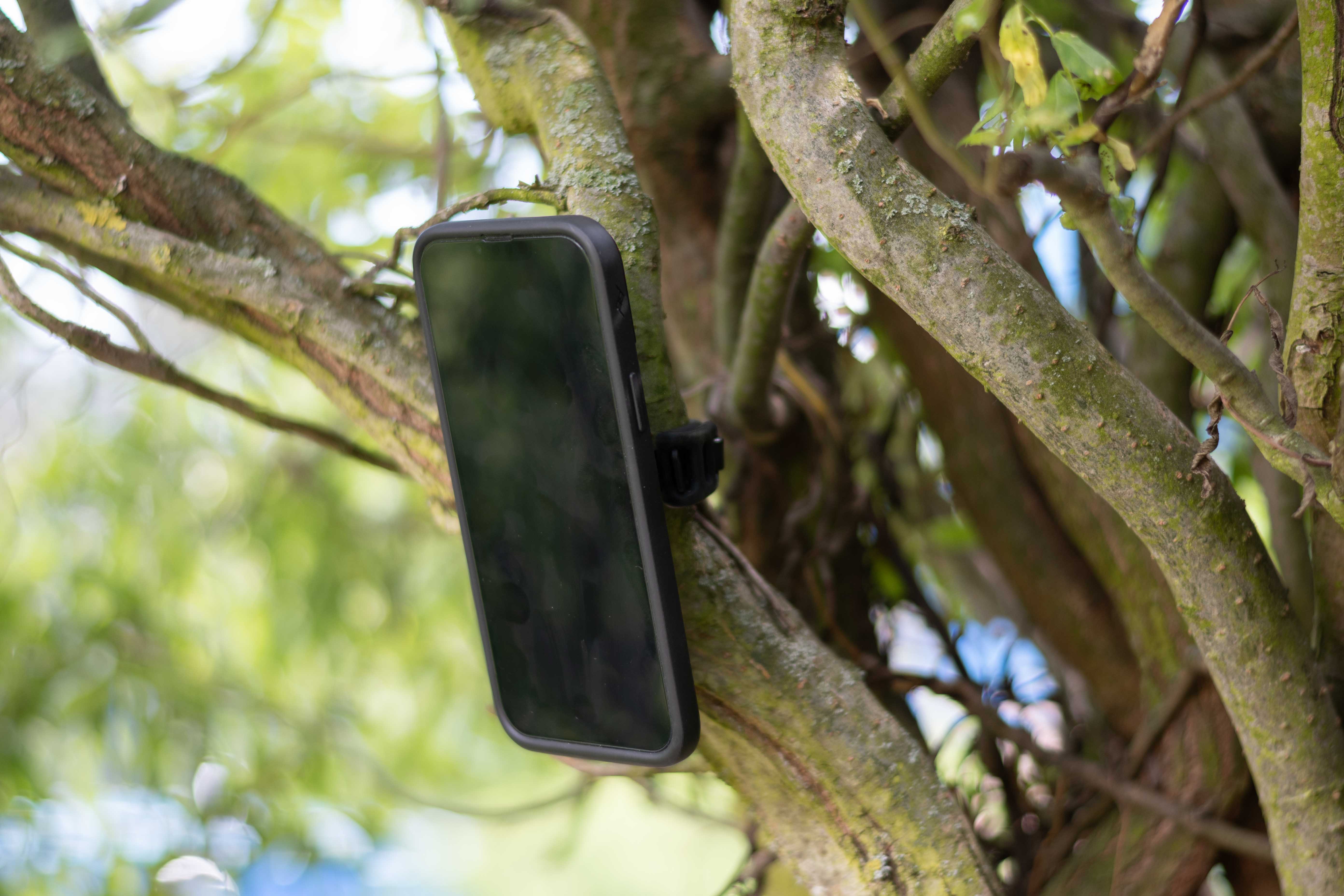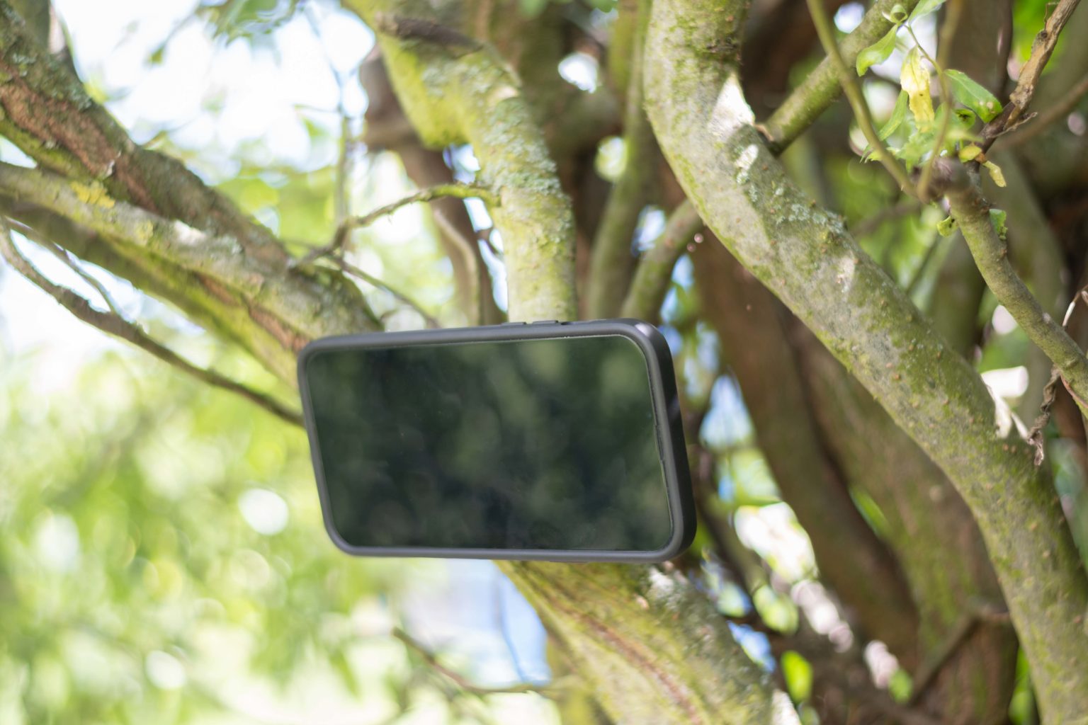 Jak již název produktu napovídá, Universal Bar Mount je univerzálním držákem vybavený speciálním silikonovým popruhem, který slouží k “obmotání” předmětu, ke kterému je třeba držák a následně telefon přichytit. Výrobce hovoří v technických specifikacích produktu sice primárně o řidítkách a tak podobně, držák je nicméně připnutelný i k jiným tvarům, což z něj dělá skutečně univerzálního pomocníka. Jediné, s čím je třeba počítat, je to, že držák je navržen pro maximální rozsah 19 až 55 milimetrů, takže do něj větev o průměru 20 centimetrů skutečně nepřichytíte.