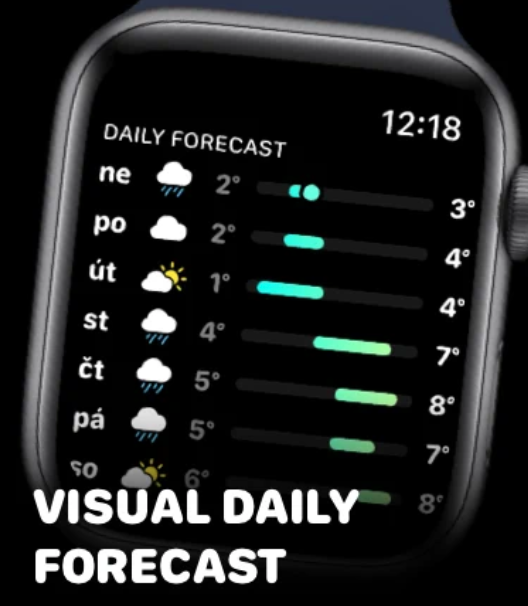 Díky aplikaci Forecast můžete na displeji vašich Apple Watch kdykoliv a kdekoliv sledovat velmi přesnou předpověď počasí se spoustou užitečných detailů. Forecast Bar nabízí možnost přizpůsobení zobrazovaných informací včetně údajů o srážkách, viditelnosti, tlaku, větru či náhlých změnách, samozřejmostí jsou také komplikace pro ciferníky.