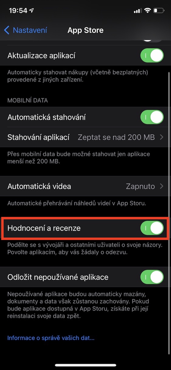 Když si stáhnete nějakou novou aplikaci, tak se vám v ní po nějaké době používání může zobrazit žádost o udělení hodnocení a recenze. Pro vývojáře je samozřejmě zpětná vazba od uživatelů velmi důležitá, aby mohlo docházet k vylepšování aplikací – někteří vývojáři ale zobrazování tohoto oznámení jednoduše přehání. Dobrou zprávou ale je, že si můžete zvolit, zdali chcete žádnosti o hodnocení nechat zobrazovat, anebo nikoliv. Stačí přejít do Nastavení → App Store, kde sjeďte níže a pomocí přepínače deaktivujte možnost Hodnocení a recenze.