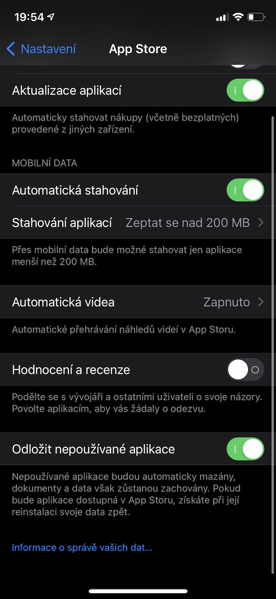 Pokud se řadíte mezi uživatele iOS delší dobu, tak jistě víte, že před několika lety bylo možné velké aplikace z App Store stahovat pouze přes Wi-Fi. Pokud byste se tehdy pokusili o stažení větší aplikace přes mobilní data, tak se vám to nepodaří. V té době však nebyla mobilní data ještě tak rozšířená, takže byl tento postoj pochopitelný. Nyní už je ale stahování velkých aplikací přes mobilní data z App Store povoleno a uživatelé si mohou nastavit, zdali se jim zobrazí alespoň oznámení o stahování velké aplikace. Pro změnu nastavení stačí přejít do Nastavení → App Store, kde v kategorii Mobilní data otevřete Stahování aplikací a klepnutím si vyberte vaše nastavení.