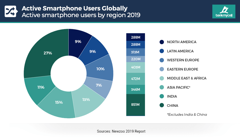 Výše jsme se podívali na podíl a počet uživatelů chytrých telefonů ve státech, nyní se podíváme na to samé v regionech. Tyto informace poskytuje portál Newzoo a nutno zmínit, že pochází z roku 2019. V Severní Americe využívá chytrý telefon 288 milionů lidí, což udává světový podíl 9 %, v Latinské Americe je pak počet uživatelů taktéž 288 milionů, tedy 9 % z celého světa. V Západní Evropě využívá chytrý telefon 313 milionů uživatelů, což udává světový podíl 10 %, ve Východní Evropě je pak počet uživatelů chytrých telefonů 220 milionů, tj. podíl 7 %. Na Blízkém východě a v Africe využívá smartphone 403 milionů lidí, což je 13 % ze světového podílu. V Asii (mimo Indii a Čínu, viz dále) využívá chytrý telefon 472 milionů lidí, tedy 15 % z celého světového podílu. Jen v Indii je pak 346 milionů uživatelů chytrých telefonů, což udává podíl 11 %. Všechny pak válcuje Čína s 851 miliony uživateli, která má světový podíl neskutečných 27 %kt. Jen pro zajímavost, 14.78 % lidí z celého světa, což je zhruba 1.1 miliarda lidí, telefon mít nemůže, a to z důvodu nedostupnosti elektřiny.