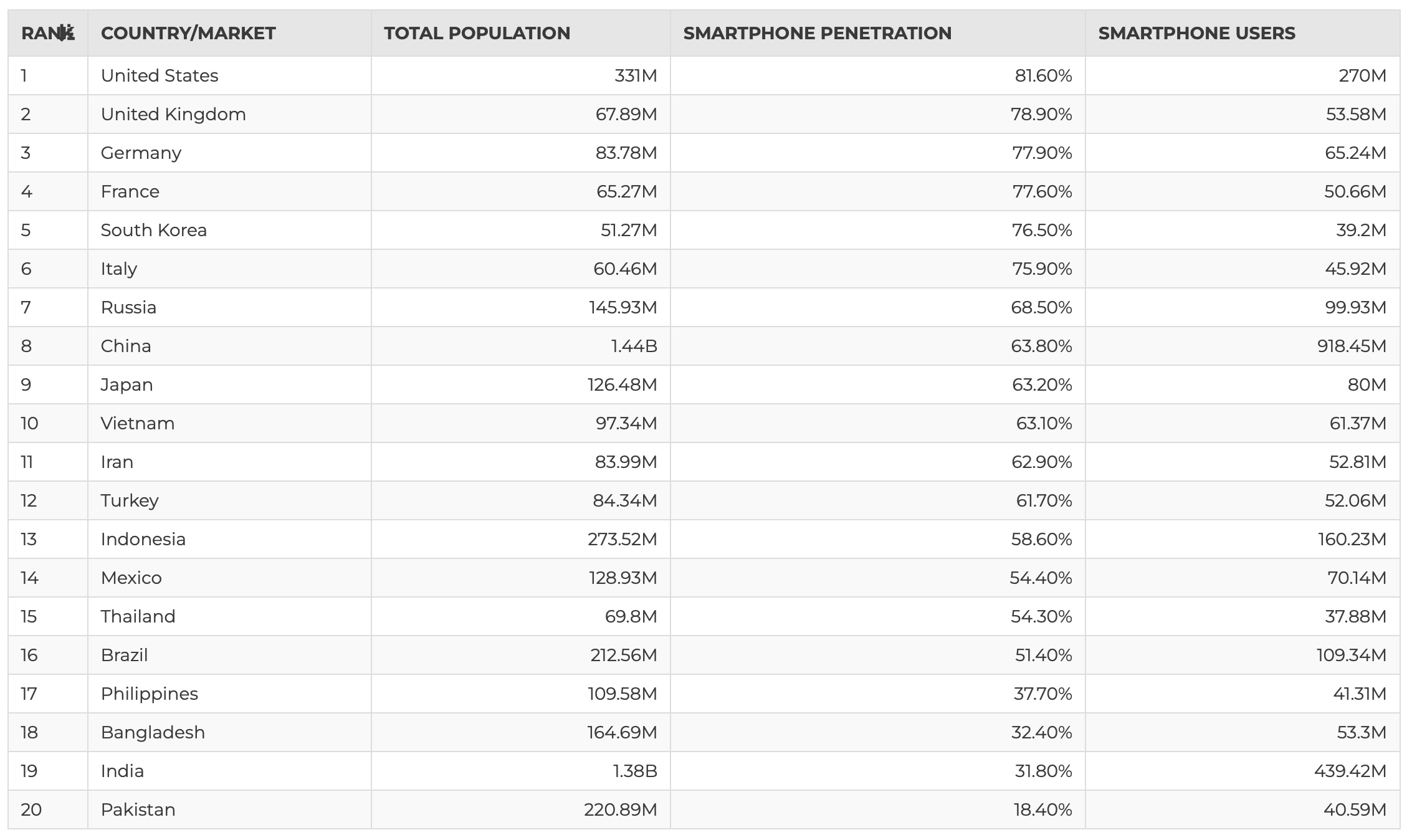 To, kolik procent obyvatel v jednotlivých státech využívá chytré telefony, se samozřejmě diametrálně liší. Největší podíl chytrých telefonů je ve Spojených státech amerických – zde využívá chytré telefony 270 milionů lidí, což udává podíl 81.60 % ze všech obyvatel. Naopak nejmenší „promoření“ telefonů je v Pákistánu, a to konkrétně 18.40 % ze všech obyvatel. Chytré telefony zde tedy využívá 40.59 milionů lidí. Co se pak týče největšího počtu uživatelů chytrých telefonů, tak vede Čína s 918.45 miliony, což udává podíl 63.80 % ze všech obyvatel. Naopak nejmenší počet uživatelů chytrých telefonů je v Thajsku, a to konkrétně 37.88 milionů, což je podíl 54.30 % ze všech uživatelů. K těmto informacím můžeme dodat, že 73.47 % lidí v deseti nejrozvinutějších zemích vlastní chytrý telefon. Naopak, 74.61 % lidí z 10 nejméně rozvinutých zemí chytrý telefon nevlastní.