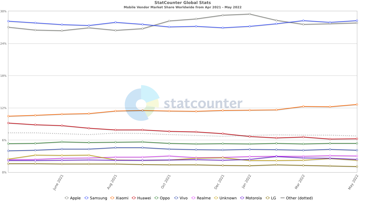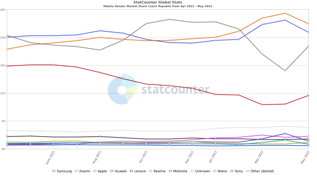 Na konci tohoto článku se budeme věnovat podílu výrobců telefonů na světovém trhu. O první místo se konkrétně pere Samsung a Apple. Podle posledních dostupných informací z května 2022 tento žebříček vede právě Samsung, a to s podílem 28.25 %. Na druhém místě je Apple, který minimálně zaostává – konkrétně má podíl 27.85 %. Na třetím místě je výrobce Xiaomi s podílem 12.63 %, čtvrté místo pak obsadil Huawei s podílem 6.26 %. Páté místo má v žebříčku společnost Oppo, která má podíl na světovém trhu 5.35 % a šesté místo patří výrobci Vivo s podílem 4.08 %. Co se týče Česka, tak zde má největší podíl Xiaomi, konkrétně 27.08 %, na druhém místě je Samsung se 25.12 %, třetí místo obsadil Apple s 22.09 %, čtvrté místo pak Huawei s 11.53 %, pátou pozici drží Realme s podílem 2.71 % a šesté místo Lenovo s 2.14 %. Podrobné grafy si můžete zobrazit v galerii níže.